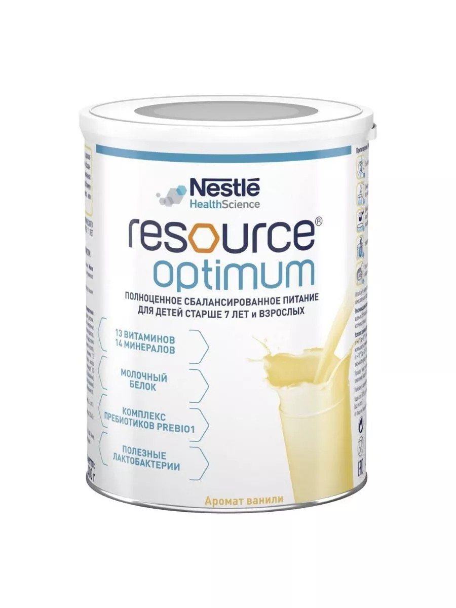 Resource Optimum Formula for Children Over 7 Years and Adults 400g. Ingredients: Contains probiotics, dietary fiber, high-quality protein, essential vitamins and minerals, and a fat blend. Indications: For children over 7 years and adults. Action: Helps cope with feelings of fatigue or weakness after illness or surgery.