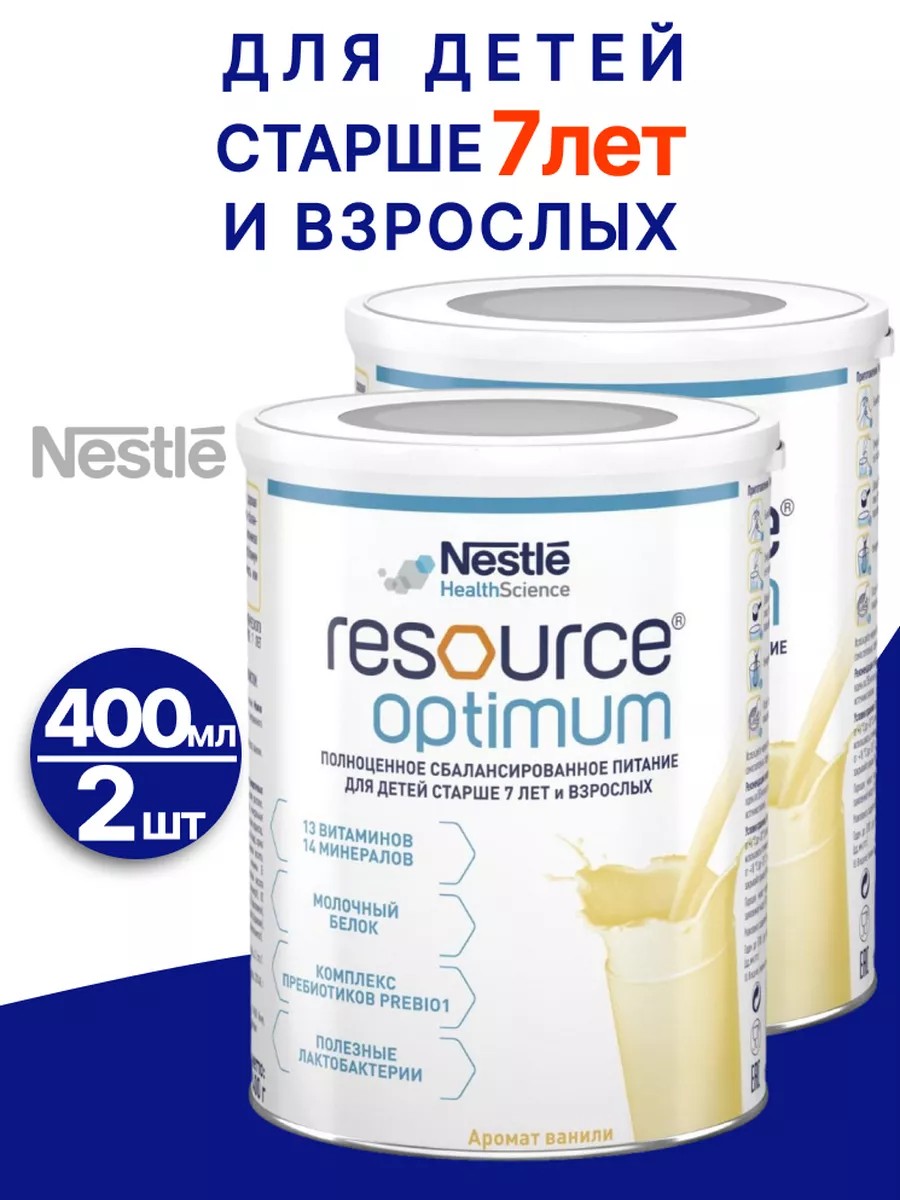 Resource Optimum - смесь, содержащая все необходимые вещества для улучшения пищеварения, восстановления сил при стрессе и укрепления иммунитета.Resource Optimum - сухая смесь для приготовления коктейля с приятным ванильным вкусом.Разработан для питания и комплексного восстановления организма детей старше 7 лет и взрослых.Используется для коррекции нарушений питания при острых и хронических заболеваниях, серьезных нагрузках, стрессе и переутомлении.Рекомендован для питания пожилых людей, чей организм часто нуждается в особенной поддержке питанием.Resource Optimum от компании Nestle - это сбалансированная смесь, которая может служить единственным источником питания.Это возможно благодаря ее составу:• оптимальное соотношение белков - 50% сывороточного белка и 50% казеина (4 г на 100 мл). Для укрепления сил, быстрого выздоровления• уникальный комплекс пребиотиков PREBIO 1 и пробиотиков. Для поддержки нормального функционирования органов пищеварения;• сбалансированный состав жиров, в том числе Омега-3 и Омега-6 кислоты. Для полноценного обеспечения энергией и крепкой нервной системы;• комплекс из 13 витаминов - Е, С, пантотеновая и фолиевая кислота, В6, В1, В2, А. Для поддержки иммунитета и стимуляции умственной деятельности;• 14 минералов, в числе которых кальций, магний, калий и другие. Для поддержки нормального обмена веществ.Ресурс Оптимум - действенная забота о здоровье ваших близких!Не содержит лактозу и глютен. Перед применением проконсультируйтесь со специалистом, который подберет правильную дозировку.Пищевая ценность Единицы измерения На 100 г порошкаЭнергетическая ценность кДж 1911ккал 456Белок г 18,5 (16%)Жиры, в том числе: г 17,5 (35%)Насыщенные жирные кислоты г 1,8Мононенасыщенные жирные кислоты г 11Полиненасыщенные жирные кислоты г 3,4Трансжиры г 0,17Углеводы, в том числе г 53,2 (47%)Сахара г 14Лактоза г 0,5Холестерол мг 25Пищевые волокна: г 5,6Минеральные веществаНатрий мг 210Хлориды мг 320Калий мг 685Кальций мг 491Фосфор мг 267Магний мг 113Железо мг 7,3Цинк мг 4,7Медь мг 0,59Йод мкг 60Селен мкг 33Марганец мкг 840Хром мкг 19Молибден мкг 35ВитаминыВитамин А мкг 390Витамин D мкг 8Витамин К мкг 46Витамин С мг 48Витамин В1 мг 0,44Витамин В2 мг 0,5Витамин В6 мг 1,8Ниацин мг 5,3Фолиевая кислота мкг 146Витамин В12 мкг 2,6Пантотеновая кислота мг 2,4Биотин мкг 11Витамин Е мг 75Таурин мг 36,4L-Карнитин мг 36,4Холин мг 209Пробиотики L.Paracasei КОЕ/г 1х10(9)Осмолярность мОсм/л 249Осмоляльность мОсм/кг 296