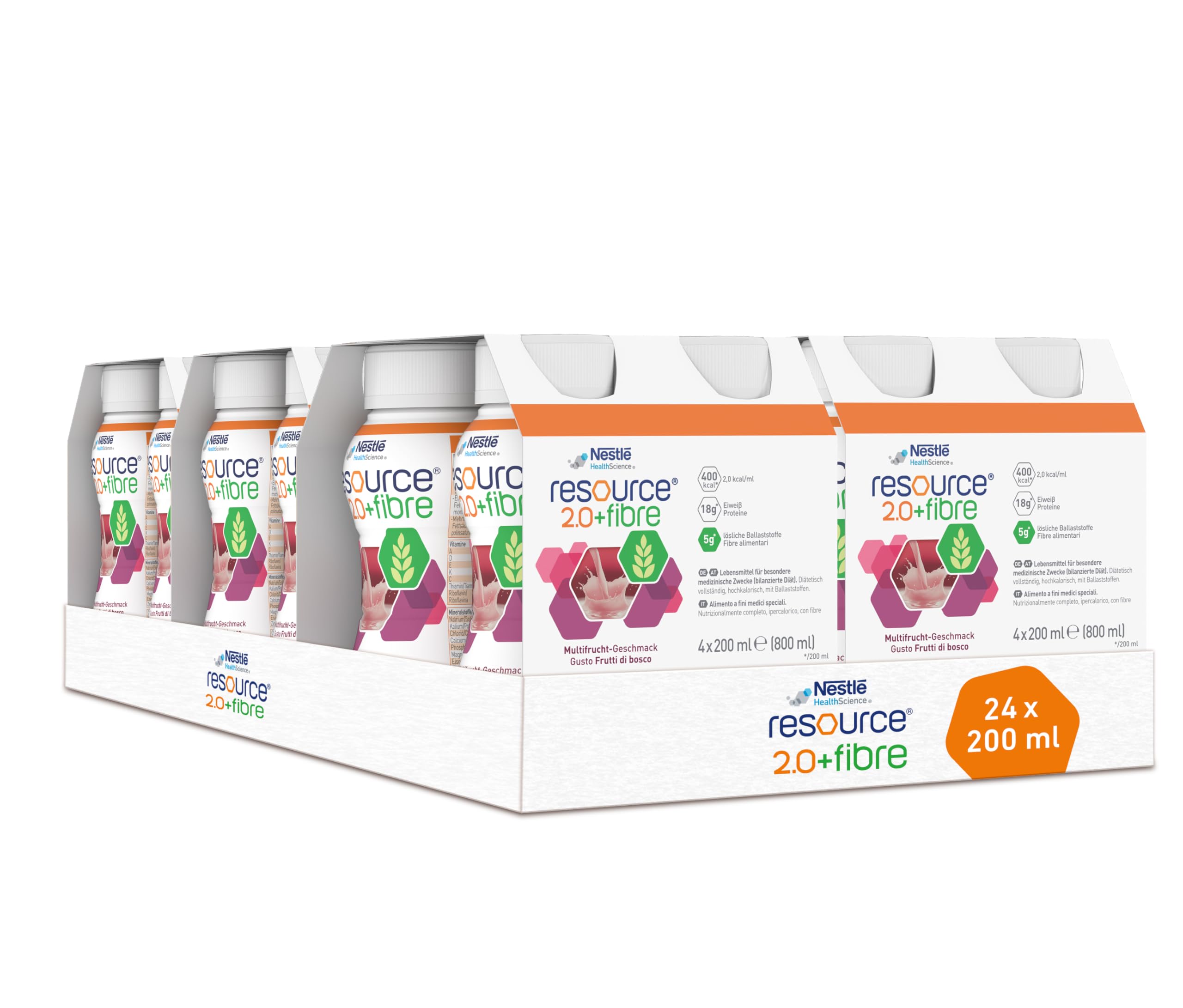 Areas of application: For managing a diet in cases of existing malnutrition or risk of malnutrition and or in cases of high energy and nutritional needs (e.g., in cases of chronic illness). Fluid restriction (e.g., in cases of heart failure). Note: For supplementary feeding: 1 to 3 bottles per day. For exclusive feeding: Follow the doctor's recommendations. Shake well before use. Tastes best fresh. Storage and usage instructions: Store unopened in a cool, dry place. Once opened, refrigerate and consume within 24 hours. Store processed foods and consume within 6 hours. Mandatory labeling: Food for special medical purposes (balanced diet). For managing a diet in cases of existing malnutrition or risk of malnutrition. Important advice: Use under medical supervision. Suitable as a sole source of nutrition. From 3 years of age. (1) Semi-monadic product test n 73, age 65 years, tested resource 2.0 neutral fiber coffee flavor, chocolate flavor resource energy, resource Ultra fruit orange flavor against equivalent competitor products, in Germany 2021. INGREDIENTS water, glucose syrup, milk proteins, rapeseed oil, sucrose, dietary fiber (fructooligosaccharides, galactooligosaccharides - contains lactose), minerals (sodium citrate, potassium citrate, potassium chloride, magnesium citrate, magnesium oxide, iron sulfate, sodium chloride, zinc sulfate, calcium citrate, manganese sulfate). copper sulfate, sodium fluoride, potassium iodide, sodium selenate, chromium chloride, sodium molybdate), emulsifier (E472e, E471), thickener (E418), vitamins (C, E, niacin, pantothenic acid, B6, B1, A, B2, D, K, folic acid, biotin), flavouring, colour (E120)resource 2.0 fibre multifrucht 24 x 200 ml Aliment à boire hautement calorique pour perte de poids non désirée Aliment pour astronautes Aliment de construction 400 calories 18 g d'œufsDESCRIPTION DU PRODUIT DESCRIPTION DU PRODUIT Domaines d'application : pour la gestion du régime en cas de malnutrition existante ou de risque de malnutrition et ou en cas de besoin énergétique et nutritif élevé (par exemple en cas de maladie consommée). Restriction hydrique (par exemple en cas d'insuffisance cardiaque). Remarque : pour une alimentation complémentaire : 1 à 3 bouteilles par jour. Pour l'alimentation exclusive : respecter les recommandations du médecin. Bien agiter avant consommation. Le goût est meilleur frais. Conservation et conseils d'utilisation : conserver non ouvert, au frais et au sec. Refermez le flacon ouvert, conservez-le au réfrigérateur et consommez dans les 24 heures. Conserver les aliments transformés et consommer dans les 6 heures. Déclaration obligatoire : aliments destinés à des fins médicales spéciales (régime équilibré). Pour la gestion du régime en cas de malnutrition existante ou de risque de malnutrition. Conseils importants : utiliser sous surveillance médicale. Convient comme seule source de nourriture. À partir de 3 ans. (1) Test de produit semi-monadique n 73, âge 65 ans, testé resource 2.0 goût fibre neutre café, goût chocolat resource energy, goût resource Ultra fruit orange contre les produits concurrents équivalents, en Allemagne 2021. INGRÉDIENTS eau, sirop de glucose, protéines de lait, huile de colza, saccharose, fibres alimentaires (fructooligosaccharides, galactooligosaccharides - contient du lactose), minéraux (citrate de sodium, citrate de potassium, chlorure de potassium, citrate de magnésium, oxyde de magnésium, sulfate de fer, chlorure de sodium, sulfate de zinc, citrate de calcium, sulfate de manganèse). sulfate de cuivre, fluorure de sodium, iodure de potassium, sélénate de sodium, chlorure de chrome, molybdate de sodium), émulsifiant (E472e, E471), épaississant (E418), vitamines (C, E, niacine, acide pantothénique, B6, B1, A, B2, D, K, acide folique, biotine), arôme, colorant (E120)
