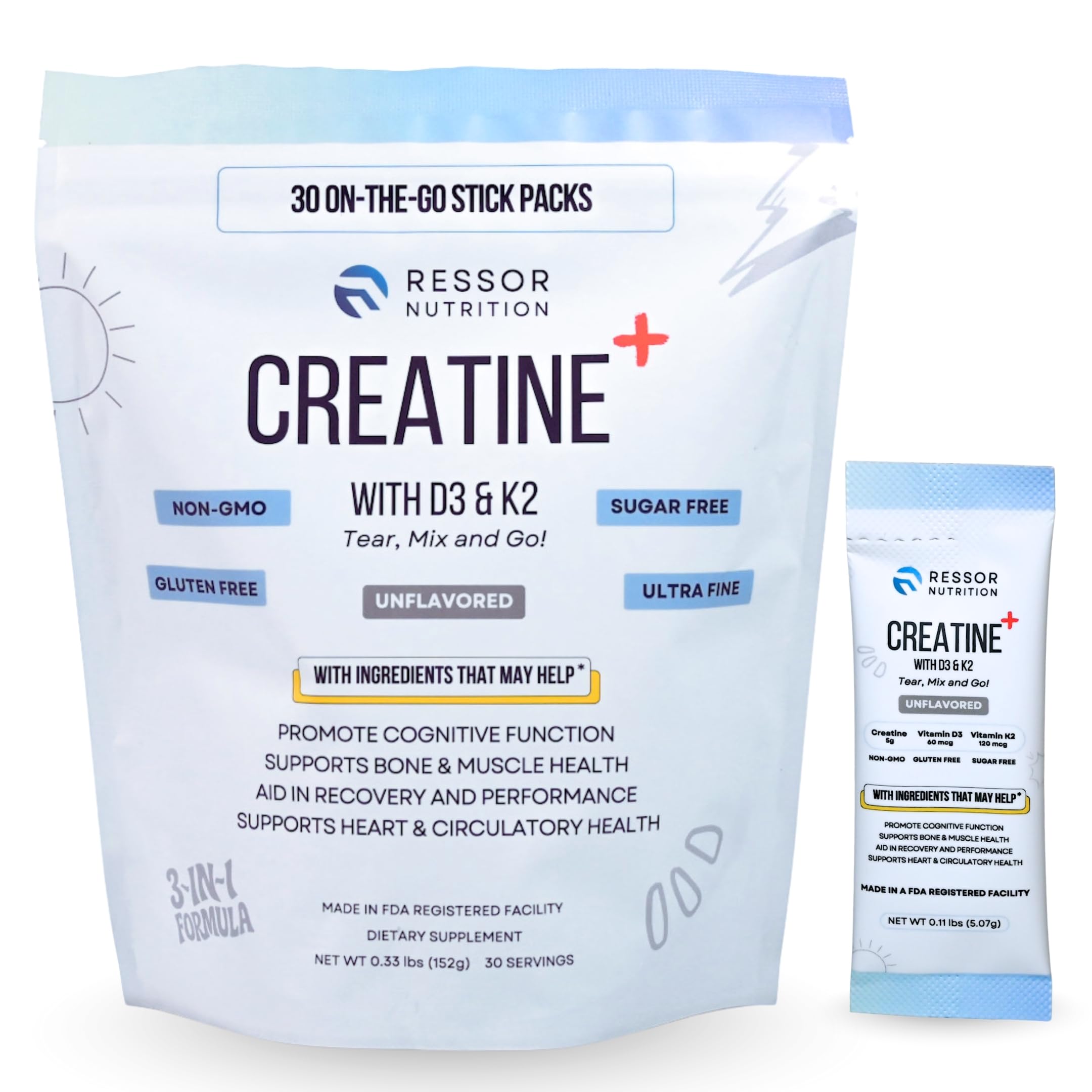 Ressor Creatine Monohydrate Powder for Men and Women 5g Micronized Creatine Travel Packs with Vitamin D3 2400 IU and Vitamin K2 120mcg