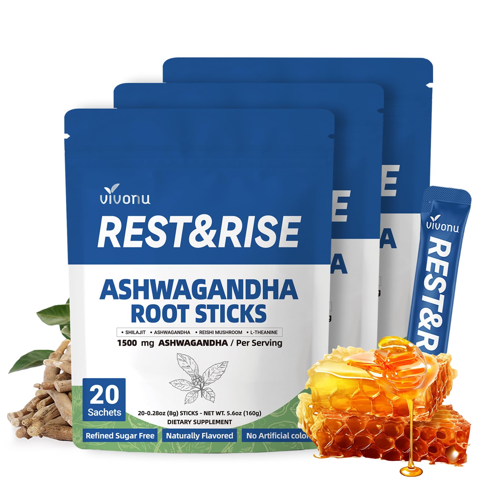 20 individual Sticks Take it on the go or mix it into your favorite beverage or food. One tablet a day is enough to lower cortisol,release stress, relax the mind, keep calm, keep the body in better condition and improve immune function. Pure naturalResin The extracts are pure, potent, and free of contaminants and heavy metals.NO GMO, Gluten Free,SoyFree Dairy Free. Perfect natural combination Perfect formula, Dcientifically blended with trace elements such as Ashwagandha Himalayan Shilajit, Organic Honey, Saffron,Curcuma, Rhodiola Rosea, Ganoderma, L Theanine Magnesium Vitamin D2, for better absorption by body. Ashwagandha Honey Sticks Naturally sweetened, tangy ashwagandha and organic raw honey for stress relief, relaxation, sleep, energy and immunity. REST RISE Sticks VivoNu 2025 New Products - REST RISE Ashwagandha Himalayan Shilajit Honey Sticks,Improves focus and concentration, supports mental performance and productivity, helps reduce fatigue, and increases energy and mental clarity and effectively Control Cortisol.