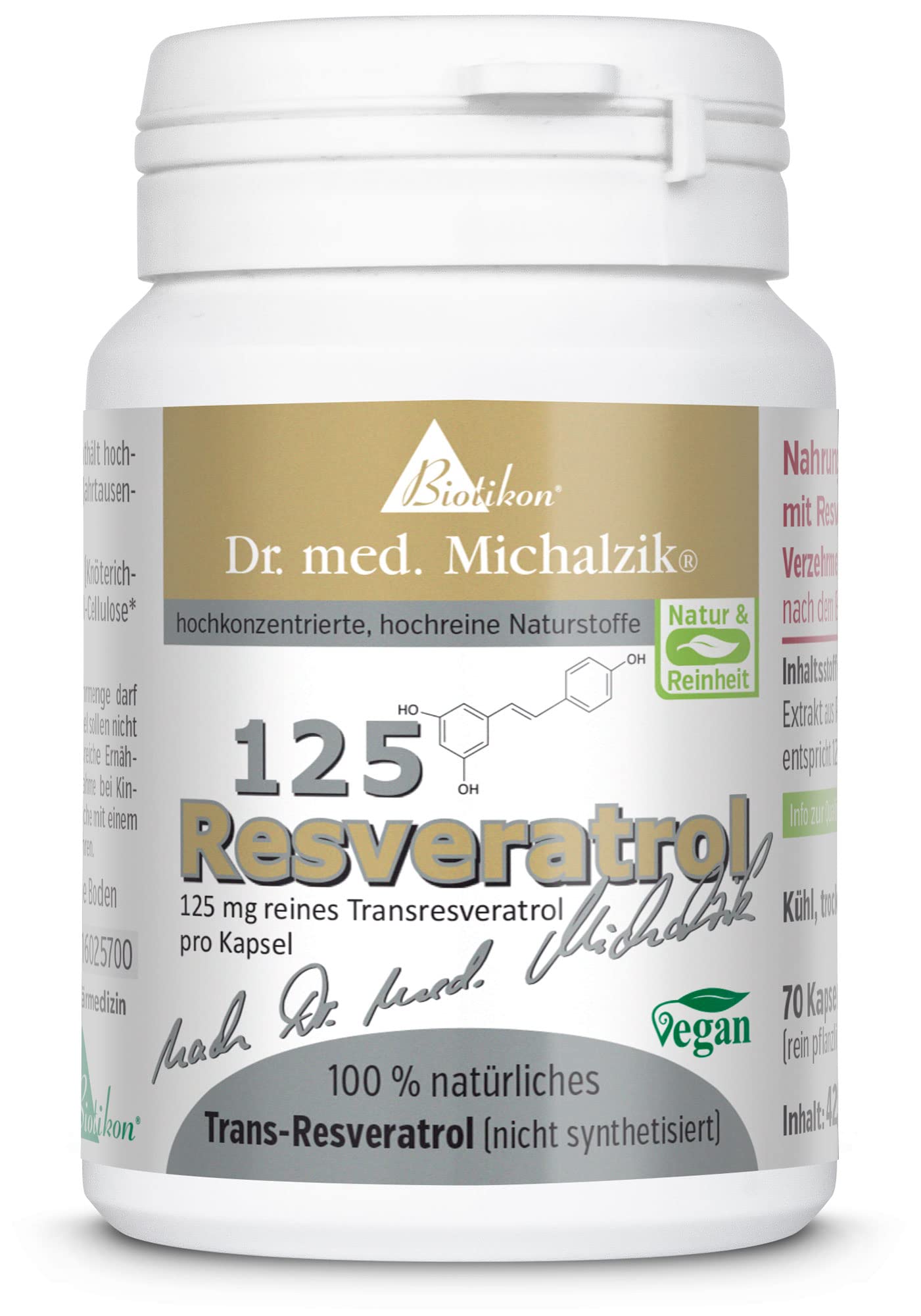 Resveratrol according to Dr.med.Michalzik contains 125 mg trans-resveratrol per capsule. It is important for resveratrol that there are no accompanying substances such as magnesium stearate, gelatin or iron oxide, because accompanying substances can affect bioavailability. With our resveratrol product, a study was carried out at the Jena University Hospital.This study was awarded a research prize.Further studies are planned.Doctors and alternative practitioners can request them from us. Optimal price-performance ratio: You will receive 292 mg of purely natural trans-resveratrol in the natural plant association per euro.125 mg of pure trans-reseratrol (3.5.4 trihydroxystilbes) per vegetarian capsule! Resveratrol was one of the most important plant substances for the old emperors who were very interested in herbal medicine. Package content: 70 capsules, each capsule contains 125 mg extract made of polygonum cuspidatum. Daily dosage: 1 resveratrol capsule after the meal. Ingredients per daily recommendation: Extract made of polygonum CUSPIDATUM 500 mg Particularly proportionate: 25 pure trans-reseratrol (3.5.4 trihydroxy stilings), residue-controlled 125 mg Suitable for vegans vegetarians! Ingredients ingredients Ingredients: extract made of polygonum CUSPIDATUM with 25 pure resveratrol, capsule material made of purely herbal cellulose: hydroxy-propyl-methyl-cellulose.This product is gelatin -free, gluten -free and lactose -free.Pet packaging, hence without plasticizers.Info on residue control: Please contact us.These are pure substances without additional and filler in the capsule filling.We deliver fresh goods. Instructions Daily dosage: 1 after eating. Warnings The recommended consumption of consumption must not be exceeded.Dietary supplements should not serve as a replacement for a balanced diet.Pregnant and breastfeeding interview a doctor before taking it!Keep cool and dry outside of the range of children. More✓ Biotikon advantages: from 70 € free shipping, HACCP food safety, 100 vegan, extract from the Japanese-perennial knotle, 25 purely natural transresveratrol, 500mg polygonum cuspidatum, over 30 years of experience in natural medicine.✓ Product guarantee: Our resveratrol 125 is manufactured after HACCP concept for food safety.Gluten -free, lactose -free, gelatin -free, genetic engineering free, not irradiated, 100 vegan.Manufacture without chemical additives such as silicon dioxide or other hidden auxiliary substances.Resveratrol 125 is offered in capsules made from vegetable cellulose, which makes it ideal for vegans and vegetarians.✓ With our resveratrol product, a study at the Jena University Clinic was carried out.This study was awarded a research prize.Further studies are planned.Doctors and alternative practitioners can request them from us.✓ IMPORTANT: With resveratrol it is that there are no accompanying substances such as magnesium stearate, gelatin or iron oxide, because accompanying substances can affect bioavailability.✓ Resveratrol according to Dr.med.Michalzik contains 125 mg trans-resveratrol, 500 mg from the Japanese perennial knotle per capsule.Resveratrol nach Dr. med. Michalzik enthält 125 mg Trans-Resveratrol je Kapsel. Wichtig bei Resveratrol ist, dass keine Begleitstoffe wie Magnesiumstearat, Gelatine oder Eisenoxid enthalten sind, denn Begleitstoffe können die Bioverfügbarkeit beeinflussen. Mit unserem Resveratrol-Produkt wurde eine Studie an der Universitätsklinik Jena durchgeführt. Diese Studie wurde mit einem Forschungspreis ausgezeichnet. Weitere Studien sind geplant. Ärzte und Heilpraktiker können diese bei uns anfordern. Optimales Preis-Leistungs-Verhältnis: Je Euro erhalten Sie 292 mg rein natürliches Trans-Resveratrol im natürlichen Pflanzenverband. 125 mg reines Trans-Resveratrol (3,5,4 Trihydroxystilben) je vegetarischer Kapsel! Für die alten Kaiser, die sehr an der Pflanzenheilkunde interessiert waren, war Resveratrol einer der wichtigsten Pflanzenstoffe. Packungsinhalt: 70 Kapseln, jede Kapsel enthält 125 mg Extrakt aus Polygonum cuspidatum. Tagesdosierung: 1 Resveratrol-Kapsel nach dem Essen. Inhaltsstoffe je Tagesempfehlung: Extrakt aus Polygonum cuspidatum 500 mg davon anteilig: 25 reines Trans-Resveratrol (3,5,4 Trihydroxystilben), rückstandskontrolliert 125 mg Für Veganer Vegetarier geeignet! INHALTSSTOFFE ZUTATEN Zutaten: Extrakt aus Polygonum cuspidatum mit 25 reinem Resveratrol, Kapselmaterial aus rein pflanzlicher Cellulose hergestellt: Hydroxy-Propyl-Methyl-Cellulose. Dieses Produkt ist gelatinefrei, glutenfrei und lactosefrei. Verpackung aus PET, daher ohne Weichmacher. Info zur Rückstandskontrolle: Bitte kontaktieren Sie uns. Es handelt sich um Reinsubstanzen ohne Zusatz- und Füllstoffe in der Kapselfüllung. Wir liefern frische Ware. GEBRAUCHSANWEISUNG Tagesdosierung: 1 nach dem Essen. WARNHINWEISE Die empfohlene Verzehrmenge darf nicht überschritten werden. Nahrungsergänzungsmittel sollen nicht als Ersatz für eine ausgewogene Ernährung dienen. Schwangere und Stillende befragen vor einer Einnahme einen Arzt! Außerhalb der Reichweite von Kindern kühl und trocken aufbewahren. Mehr✓ BIOTIKON Vorteile: ab 70€ Versandkostenfrei, HACCP Lebensmittelsicherheit, 100 vegan, Extrakt aus dem japanischem-Staudenknöterich, 25 rein natürliches Transresveratrol , 500mg Polygonum cuspidatum , über 30 Jahre ERFAHRUNG in der Naturmedizin. ✓ PRODUKTGARANTIE: Unser Resveratrol 125 wird nachdem HACCP-Konzept zur Lebensmittelsicherheit hergestellt. Glutenfrei, lactosefrei, gelatinefrei, gentechnikfrei, nicht bestrahlt, 100 vegan. Herstellung ohne chemische Zusatzstoffe, wie Siliziumdioxid oder andere versteckte Hilfsstoffe. Resveratrol 125 wird in Kapseln angeboten, die aus pflanzlicher Cellulose hergestellt sind, dadurch ist es für Veganer und Vegetarier bestens geeignet. ✓ Mit unserem Resveratrol-Produkt wurde eine Studie an der Universitätsklinik Jena durchgeführt. Diese Studie wurde mit einem Forschungsp