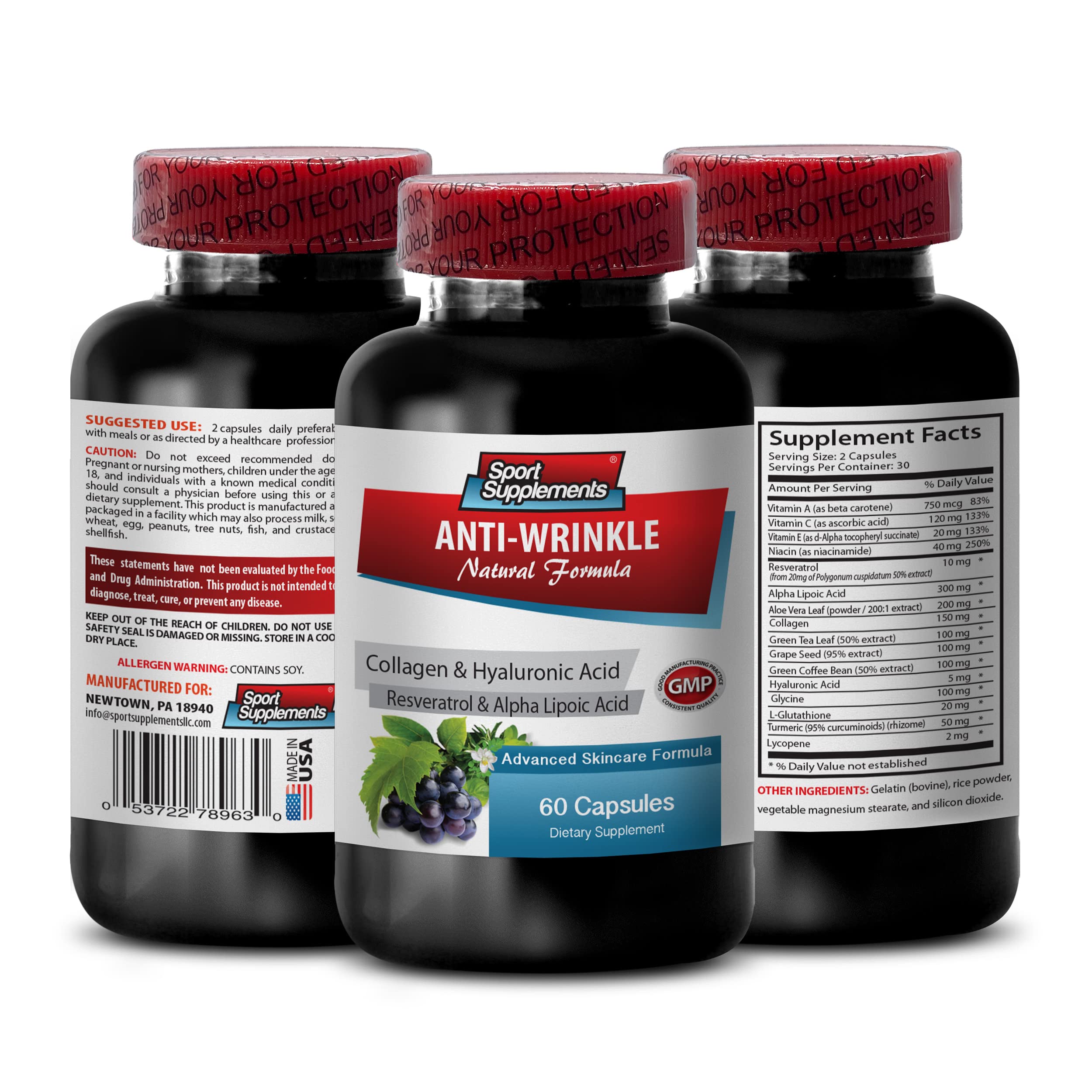 Resveratrol pills - Anti-Wrinkle Pills - Best anti aging skin care, collagen supplements, resveratrol, hyaluronic acid, l-glycine, DMAE, anti aging supplement, anti wrinkle for face, 1 Bottle 60 Capsules Anti-aging or Anti-wrinke Natural Formula - based cosmeceutical skin care products marketed with the promise of making the consumer look younger by reducing, masking or preventing signs of skin aging. These signs are laxity (sagging), rhytids (wrinkles), and photoaging, which includes erythema (redness), dyspigmentation (brown discolorations), solar elastosis (yellowing), keratoses (abnormal growths), and poor texture. Unique Anti-Wrinkle Supplement - This premium blend of anti aging skin care vitamins helps increase skin hydration and elasticity, reduces fine lines and wrinkles. Anti-Wrinke Natural Formula Benefits - Loaded with powerful antioxidants to help prevent aging of skin. Delay the aging process by even a few years and enjoy enormous social benefits. Clinically Proven - ingredients work to reduce fine lines and wrinkles and will restore your skin's youthful glaze. Complete your age-defying transformation TODAY!! Hyaluronic Acid - has many benefits, naturally found in the body hyaluronic acid secures moisture and creates fullness—youthful skin. In skin care you can find hyaluronic acid in supplements. Hyaluronic acid is extremely beneficial as an oral supplement as it plays a critical role in the production of collagen. Collagen - is the most abundant protein in the body. Collagen is critical to the skin because it supports skin structure. As body collagen declines, the appearance of wrinkles and discoloration become more visible. Maximizing collagen levels will keep skin supple. Please Note - Should you experience any discomfort after using the product please discontinue use and consult a healthcare professional.