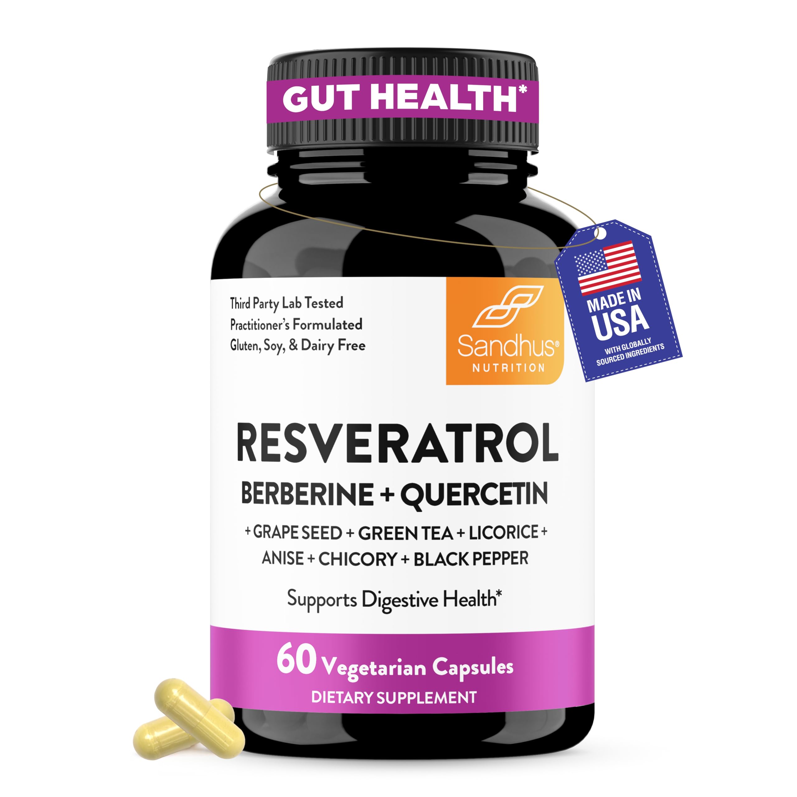 Resveratrol with Berberine Supplement For Gut Health Support | 60 Digestive Capsules For Women & Men | With Green Tea Extract Star Anise DGL Grape Seed & Quercetin | Helps Ease Bloating & Digestion 60 Count (Pack of 1)