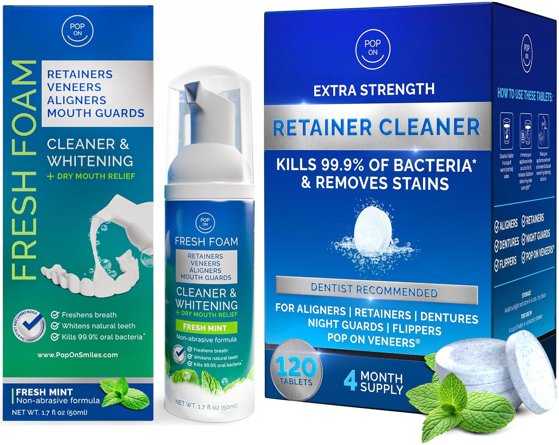 4-MONTH SUPPLY TRAVEL-READY FOAM – Includes 120 individually wrapped dental tablets for everyday deep cleaning and a portable bottle of retainer cleaning foam—perfect for travel, office, or gym. Stay confident and fresh with the ultimate bundle for your dental appliances. SAFE FOR ALL APPLIANCES, LOVED BY DENTISTS – This dual-care bundle is bleach-free, non-abrasive, and dentist recommended. Safe for daily use on Invisalign aligners, night guards, mouth guards, dentures, veneers, and Pop On Veneers. Ideal for maintaining dental hygiene at home or on the go. KILLS 99.9 OF BACTERIA GENTLE TEETH WHITENING – Our cleaning tablets eliminate plaque and bacteria that cause bad breath, while the aligner whitening foam with 3 hydrogen peroxide gently whitens teeth under your appliance without sensitivity—so your smile stays fresh, healthy, and bright. ? FAST POWERFUL CLEANING, ANYTIME, ANYWHERE – Use the extra strength retainer cleaning tablets in your dental pod or ultrasonic retainer cleaner for powerful cleansing in just 5 minutes. On-the-go? Grab the quick-dissolve whitening foam for fast, mess-free freshness and odor elimination—no brushing or rinsing needed. ✓ COMPLETE ORAL APPLIANCE CLEANING KIT, TABLETS FOAM COMBO – Get the best of both worlds: deep-cleaning retainer cleaner tablets for ultrasonic machines and on-the-go aligner cleaner fresh foam. Perfect for Invisalign, retainers, mouthguards, dentures, and more—this bundle delivers professional-level hygiene, clarity, and convenience.