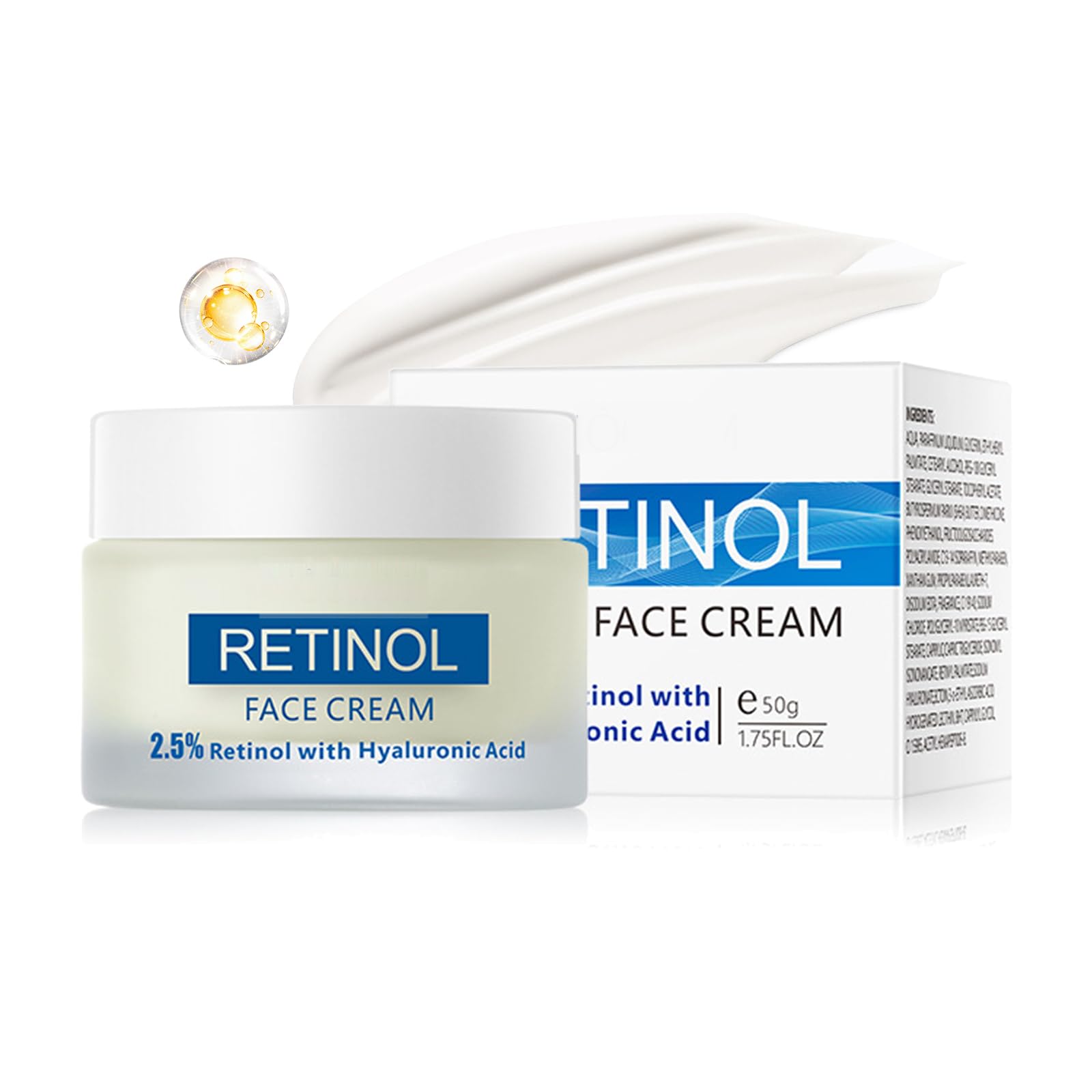 MULTI-PURPOSE RETINOL CREAM: This hyaluronic acid-enriched retinol cream suits all skin types. can be used morning and night on the face, neck, and other areas, providing comprehensive care with noticeable results. LIGHTWEIGHT NON-GREASY: Our moisturizing cream features a lightweight texture that absorbs quickly and effortlessly. Its hydrating formula protects and nourishes skin during the day while repairing and nourishing it overnight. ANTI-AGING WRINKLE REDUCTION: Ingredients like retinol in this anti-aging cream effectively combat signs of aging, smooth wrinkles, and lift facial contours for smoother, softer skin. HYDRATION MOISTURE LOCK: Two premium hydrating ingredients—hyaluronic acid and glycerin effectively deeply moisturize the skin, locking in moisture and preventing water loss for long-lasting hydration. Say goodbye to dry skin!. RETINOL CREAM FOR FACE: This retinol cream visibly plumps skin, helping maintain hydration and fullness while deeply nourishing and strengthening the skin barrier. It enhances elasticity and firmness.