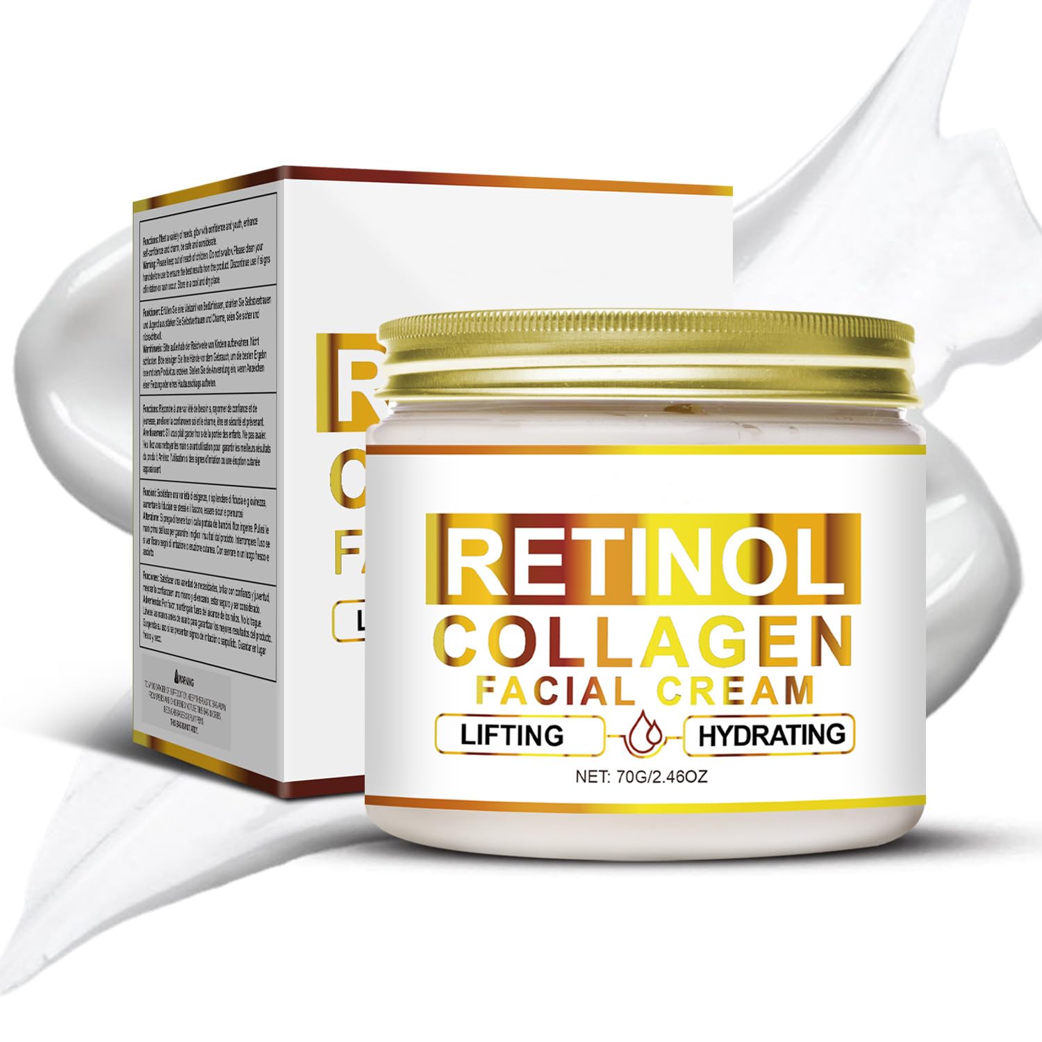 Specification: Name: Retinol Collagen Cream Brand: Grospe Color: White Capacity: 70g Package List: 1 Retinol Collagen Cream Shelf life: Three Years Tips: Place in a shady location in order to protect the stability of product ingredients Benefits:Provides deep hydration and moisturization, anti-aging, firming, preventing sagging, reducing fine lines, laugh lines and wrinkles, leaving your skin glowing and returning to its youthful radianceUsage :After cleansing the skin, take an appropriate amount of the cream and apply it to the face, gently massaging and lifting in a circular motion until it is completely absorbed. Recommended to use every morning and evening, adhere to the long-term use of better results!. Suitable for all skin types :Made with a gentle formula that is easily non-greasy and absorbs quickly, Retinol Face Cream is suitable for all skin types, giving you the perfect skin care experience, ideal for your daily skincare routine. Deeply Moisturizies :Our retinol cream is enriched with hyaluronic acid, which can effectively provide deep moisturization for the skin and lock the skin moisture, preventing the loss of skin moisture, moisturizing the skin, so that your skin stays moist for a long time, reducing the tightness caused by dryness, and saying goodbye to dry skin from now on!. Anti-aging :Retinol Collagen Cream also adds collagen ingredients, can act on the body's collagen, stimulate the body's own collagen synthesis, promote cell metabolism, thus improving skin elasticity, firming the skin, so that your skin regains its youthful luster and radiance. Retinol Collagen Cream :Retinol Collagen Cream is specially formulated with Retinol, which promotes skin cell regeneration, refreshes dull skin, increases skin suppleness, prevents sagging, reduces the appearance of fine lines, laugh lines and wrinkles, and restores skin elasticity.