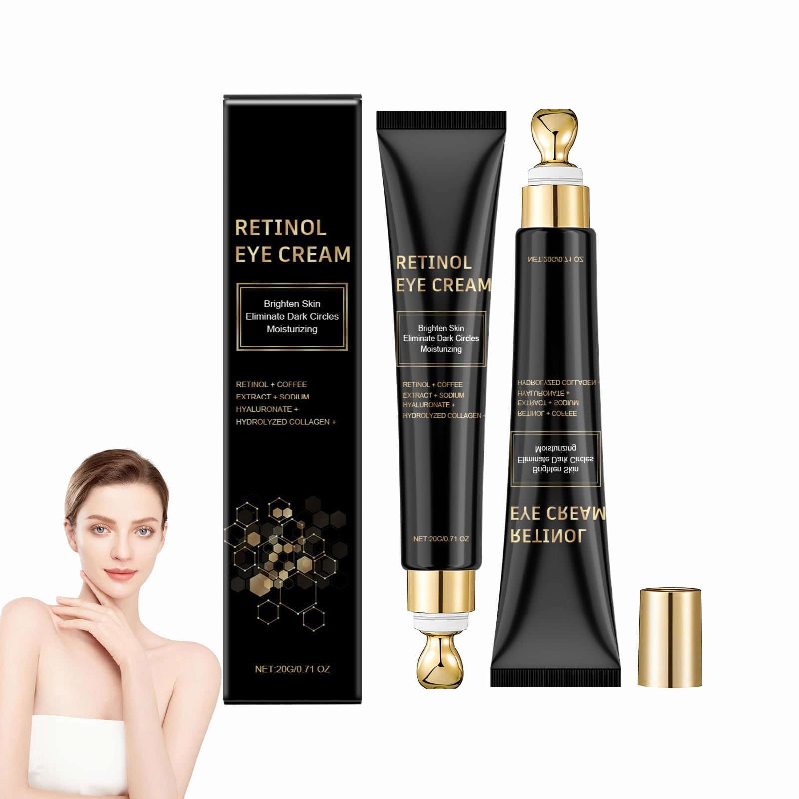 Retinol eye cream with cooling roller, anti-aging eye cream SAFETY WARNING For external use only. Avoid contact with the eyes. Keep it away from open flames and direct heat sources.It helps to maintain the hydrophilicity and soothing properties of the skin and provides long-lasting water syndrome. Closed tightly, it looks strong and even. Gentle and non-irritating: Our moisturizing, firming anti-wrinkle eye cream contains no irritants and is suitable for all skin types. Refreshing texture and easily absorbed: our anti-aging eye cream has a watery texture that is easily absorbed when massaging. Provides the skin with intensive moisture, even in dry winters. Integrated massage head: The moisturizing anti-wrinkle eye cream can accelerate the absorption of the eye cream, so that the nutrients reach the lower layer of the skin. The moisture is completely filled and the wrinkles are removed more clearly. Multi-moisturizing and repairing eye cream: Our eye cream can moisturize the skin of the eyes for a long time, preventing dry skin and wrinkles. At the same time it firms the skin and gives it new vitality.Retinol Oogcrème met koelrol, anti-aging oogcrème, dieptewerking tegen rimpels, lichter en verstevigend, vermindert donkere kringen onder de ogen, vermindert wallen onder de ogen, voor mannen en 2 stuks. 1 ml (1er Pack) Retinol oogcrème met koelrol, anti-aging oogcrème VEILIGHEIDSWAARSCHUWING Alleen voor uitwendig gebruik. Vermijd contact met de ogen. Houd het uit de buurt van open vuur en directe warmtebronnen.Het helpt om de hydrofilie en de kalmerende eigenschappen van de huid te behouden en zorgt voor een langdurig watersyndroom. Stevig gesloten, ziet hij er sterk en gelijkmatig uit. Zacht en niet-irriterend: onze vochtinbrengende, verstevigende anti-rimpel oogcrème bevat geen irriterende stoffen en is geschikt voor alle huidtypes. Verfrissende textuur en gemakkelijk intrekkend: onze anti-aging oogcrème heeft een waterige textuur die gemakkelijk wordt opgenomen bij het masseren. Verzorgt de huid ook in droge winters intensief van vocht. Geïntegreerde massagekop: de vochtinbrengende anti-rimpel oogcrème kan de opname van de oogcrème versnellen, zodat de voedingsstoffen de onderste huidlaag bereiken. Het vocht wordt volledig gevuld en de rimpels worden duidelijker verwijderd. Multi-hydraterende en herstellende oogcrème: onze oogcrème kan de huid van de ogen langdurig hydrateren, waardoor droge huid en rimpels worden voorkomen. Tegelijkertijd verstevigt het de huid en geeft het nieuwe vitaliteit.