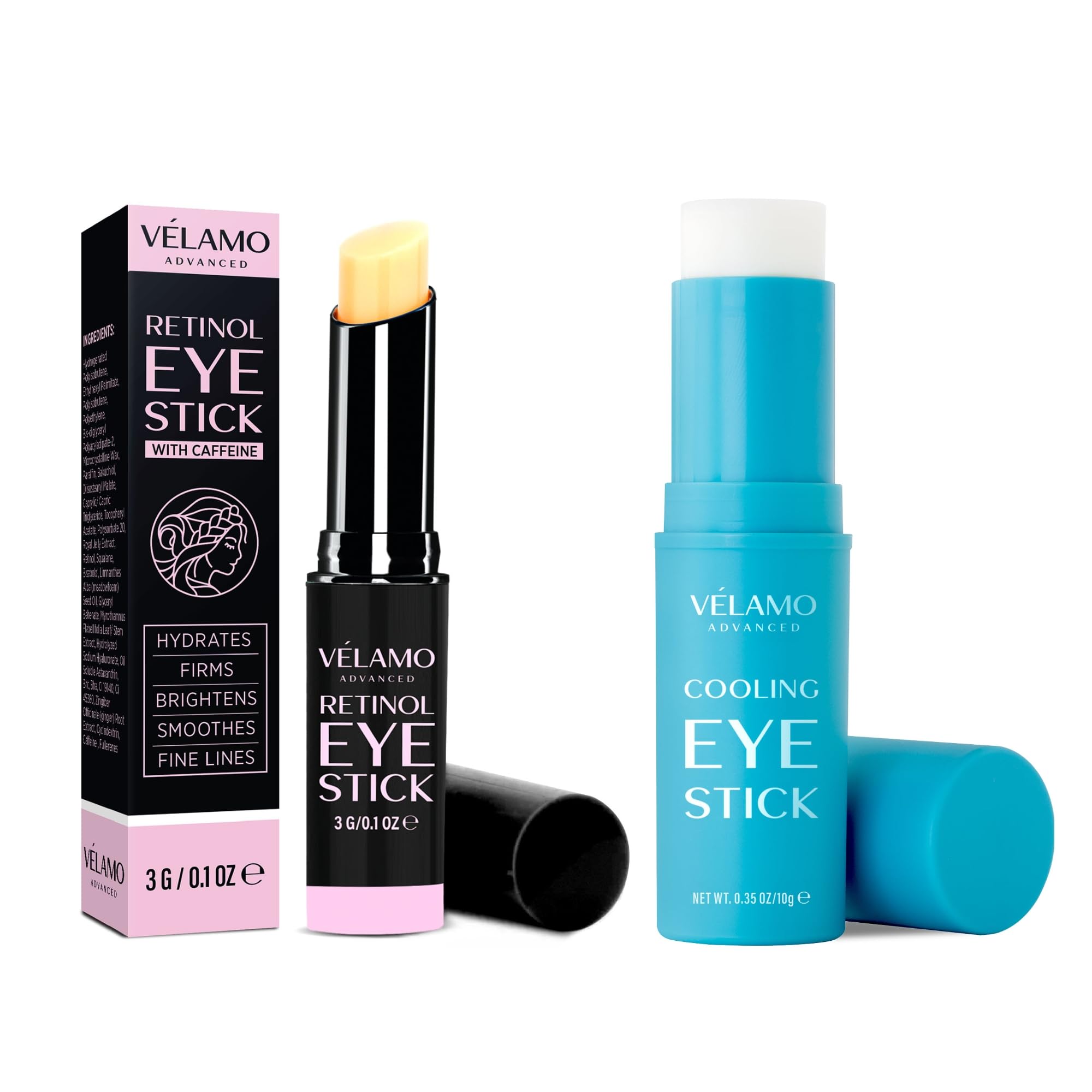 Cooling Eye Balm Stick with Caffeine: Under Eye Cream for Dark Circles Puffiness Eye Bags - Hyaluronic Acid Instantly Cooling, Hydrating Brightening - Portable Perfect for On-the-go Use 0.35 oz. VELAMO ADVANCED Retinol Eye Stick: Retinol Eye Cream for Dark Circles and Puffiness with 1 Bakuchiol and Caffeine - Visibly Reduces Fine Lines Wrinkles Under Eye Bags with Upgraded Formula 0.1 OZ 3g.