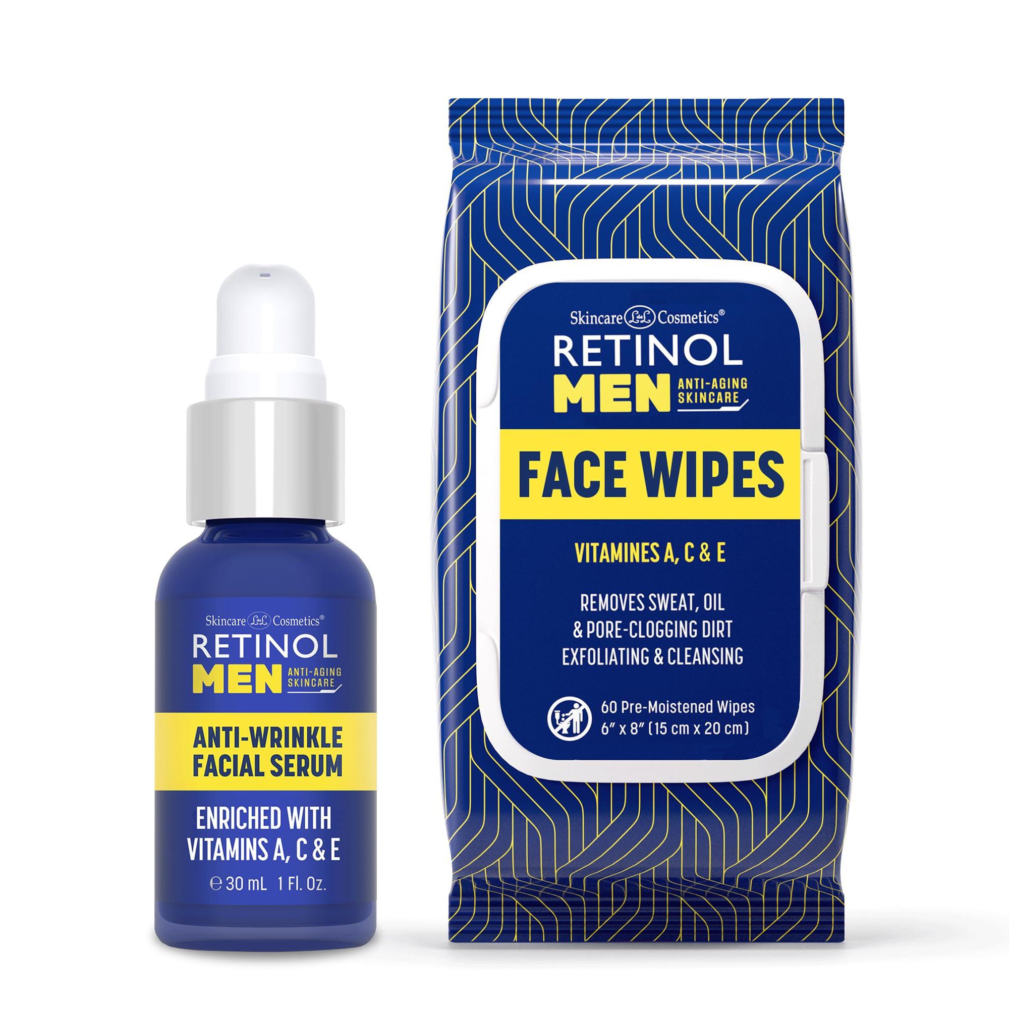 Retinol Men Facial Serum - Vitamin-Enriched Smooth Fine Lines & Wrinkles + Retinol Men Facial Wipes - Quickly Cleanses Face from sweat oil and pore-clogging dirt without any heavy residue