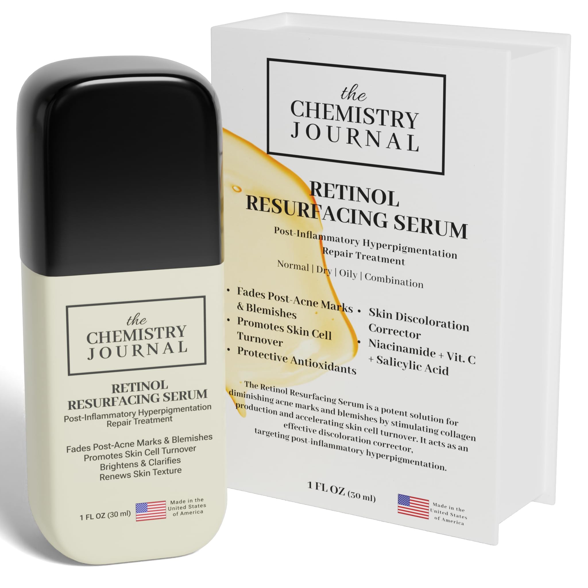 MADE IN THE UNITED STATES OF AMERICA - Skincare made in the United States of America not only guarantees superior quality, safety and efficacy but also reflects a commitment to ethical practices, innovation, and consumer trust. { SOOTHES AND BALANCES SKIN } Niacinamide and Vitamin C work together to calm redness, enhance hydration, and improve overall skin health. { IMPROVES SKIN TEXTURE } Promotes smoother, softer skin by exfoliating and revitalizing the surface layer. { CLEARS AND REFINES PORES } Salicylic acid and tea tree oil unclog pores, reduce blemishes, and promote a clear, healthy complexion. { REDUCES WRINKLES AND FINE LINES } Retinol enhances skin cell renewal, reducing visible signs of aging for a smoother, firmer appearance. { POST INFLAMMATORY HYPERPIGMENTATION REPAIR TREATMENT } Fades post acne marks, brightens dark spots and evens skin tone with the powerful synergy of Retinol, Vitamin C, and Niacinamide.