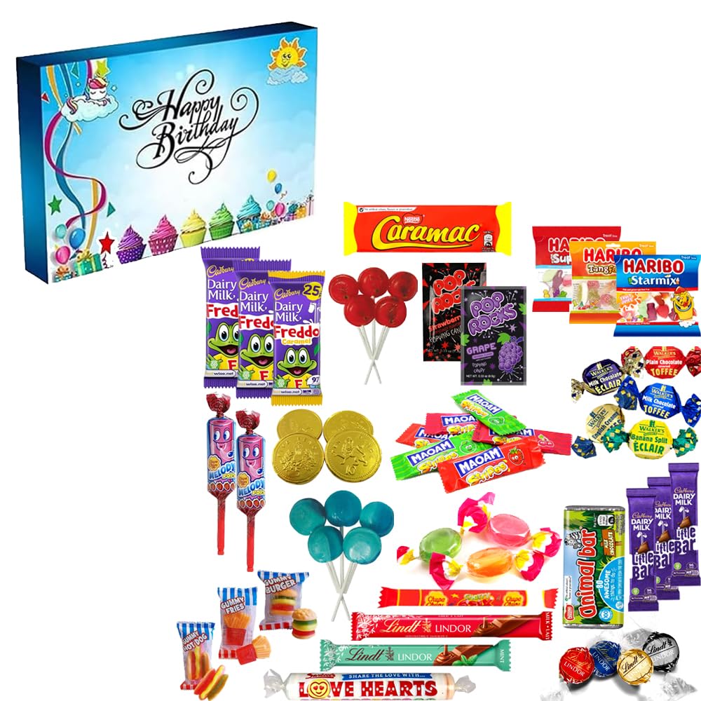 We will send random mixed chocolates & sweets. Perfect gift for a classic sweet lover!. Happy Birthday Box Colour - Blue Colour , Happy Birthday Box Size - C6. We will send random mixed chocolates & sweets. Retro Sweets & Chocolate Mixed Hamper Gift Box.