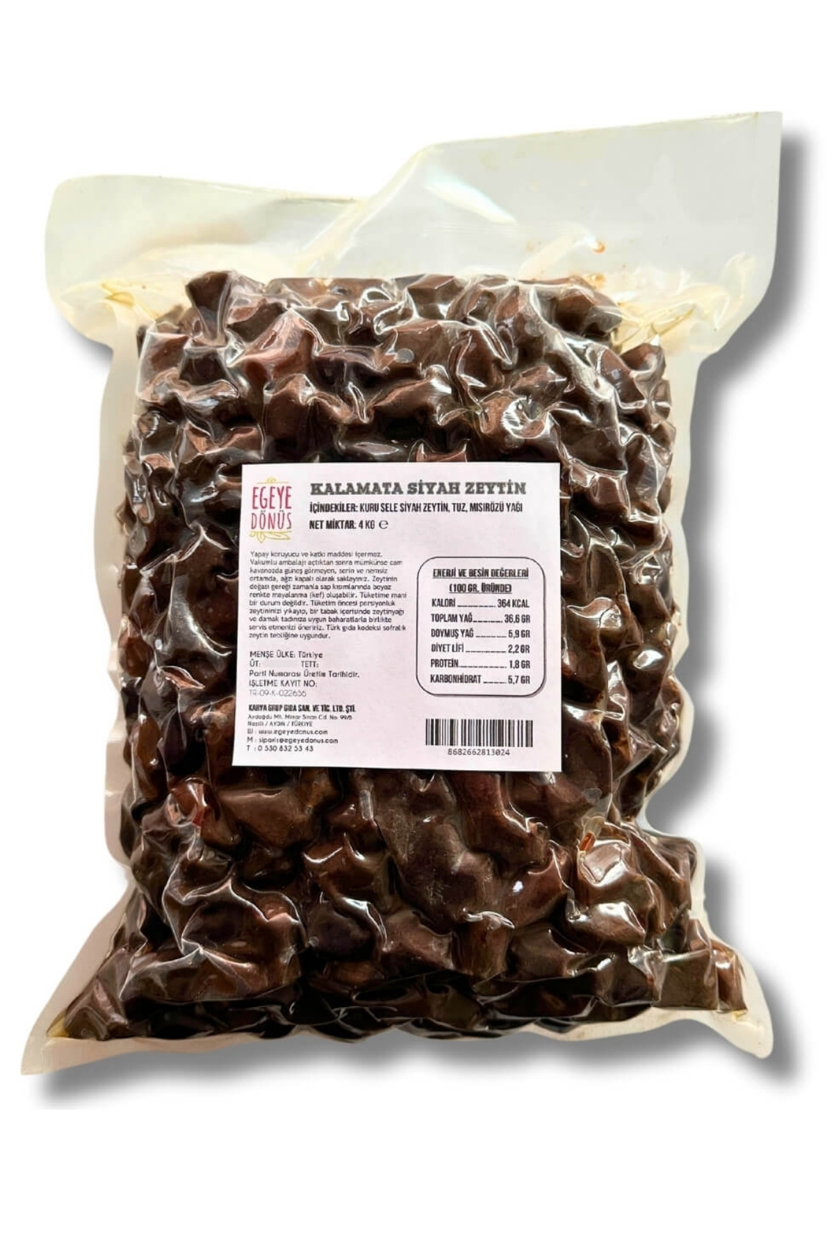 Kalamata kuru sele siyah zeytinlerimiz sizlere 4 kilogramlik özel vakumlu ambalajinda ulasir.
