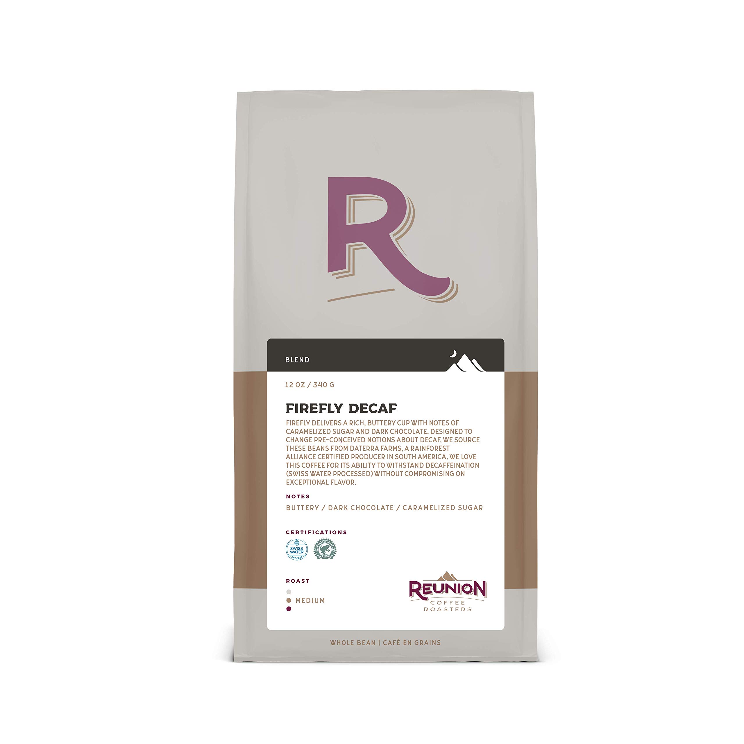 Reunion Coffee Roasters Swiss Water Process Firefly Decaf Whole Bean Coffee 12oz Firefly Decaf 12 Ounces