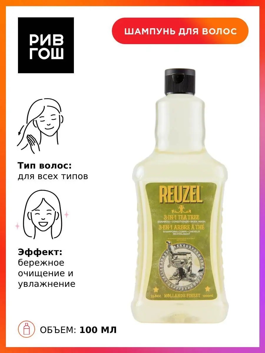 Все что нужно в одном флаконе! Шампунь для волос, кондиционер для волос и гель для душа - мечта минималиста, который не любит большое количество банок в ванной, но любит эффективный и многофункциональный уход. Очищает кожу головы, тело и волосы от загрязнений и содержит фирменный настой Reuzel из 4 трав, который увлажняет, укрепляет, тонизирует и защищает волосы и кожу от обезвоженности. Активные компоненты: 4 blend - это настой из гамамелиса, листьев крапивы, розмарина и корня хвоща. Не только эффективно очищает кожу голову и волосы, но и ухаживает за волосами при каждом мытье головы. Масло чайного дерева обладает антисептическими свойствами и помогает в борьбе с проблемами кожи головы. Шампунь 3 в 1 для волос муж., 1000 мл У нас Вы всегда сможете подобрать женскую и мужскую парфюмерию, декоративную косметику, а так же уходовые средства для волос, тела и лица. РИВ ГОШ вдохновляет дарить подарки каждый день. Шампунь для волос это незаменимое средство в обиходе любого современного человека. Он обладает уникальной формулой, специально разработанной для увлажнения и укрепления ваших локонов. Богатый состав продукта содержит качественные и активные ингредиенты, которые питают и восстанавливают пряди. Шампунь сделает ваши волосы более объемными и блестящими.