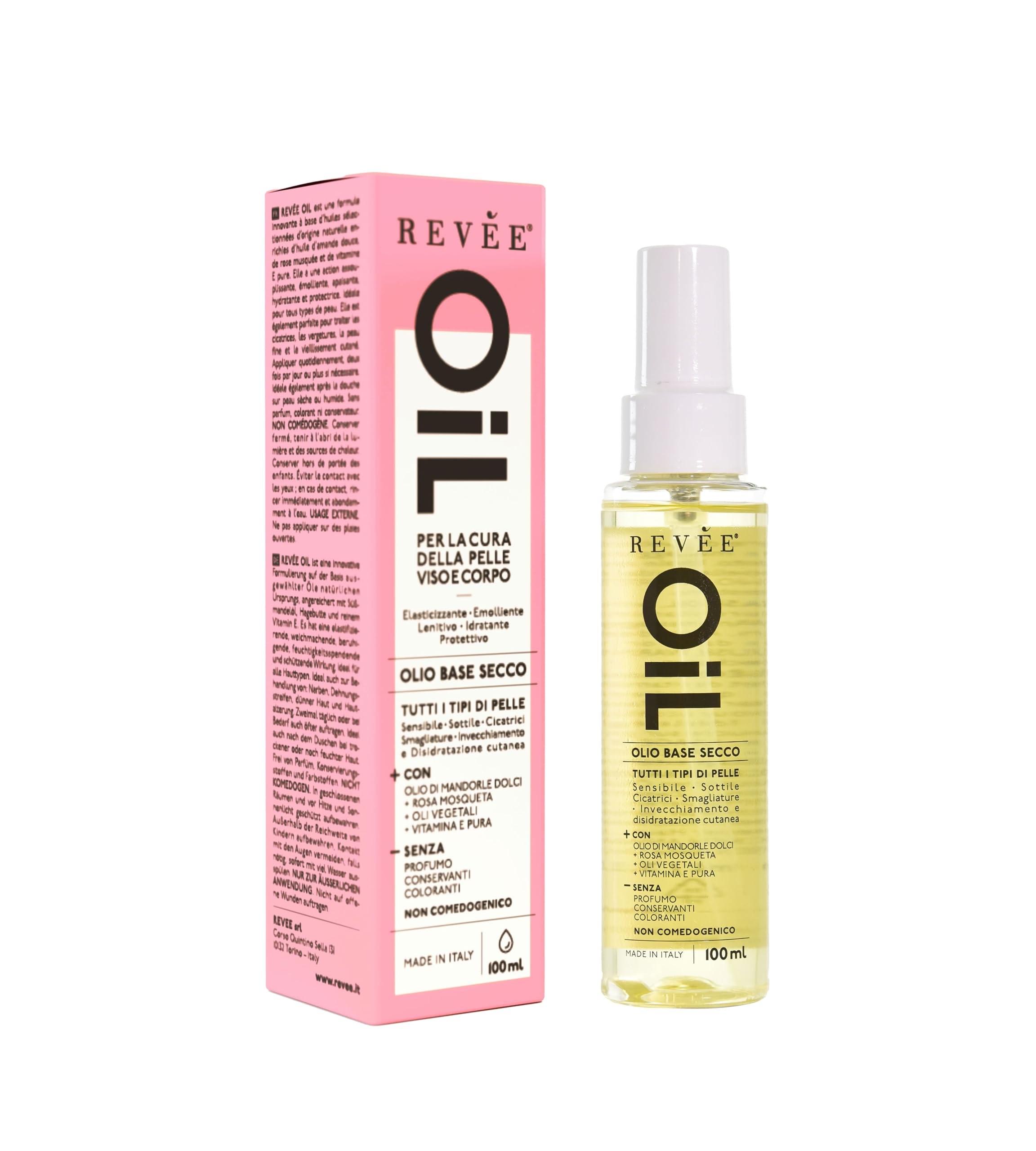 REVÉE: innovation, health and beauty. For over ten years, we have specialized in post-operative products for cosmetic and reconstructive surgery and personal well-being. DAILY USE: Apply Revée Oil regularly, twice a day or more often if necessary. Also ideal after bathing or showering on dry or damp skin to maximize the benefits. INNOVATIVE FORMULATION: with sweet almond oil, rosehip, Fermentoil Complex, pure vitamin E. No added perfumes, preservatives or colorants. FOR RENEWED SKIN: Works effectively by making the skin softer and hydrated. Offers an elasticizing, emollient, soothing, moisturizing and protective action. Ideal for the treatment of scars, stretch marks, thin skin and signs of aging. REVÉE OIL: Dry base oil for the well-being and health of your skin. Innovative formulation based on selected oils of natural origin enriched with pure vitamin E. Suitable for all skin types, face and body. Non-comedogenic.REVÉE: innovation, santé et beauté. Depuis plus de dix ans spécialisés dans les produits post-opératoires pour la chirurgie esthétique, reconstructive et le bien-être de la personne. UTILISATION QUOTIDIENNE: appliquez Revée Oil régulièrement, deux fois par jour ou plus souvent si nécessaire. Idéal aussi après le bain ou la douche sur peau sèche ou encore humide pour maximiser les bienfaits. FORMULATION INNOVANTE: avec de l'huile d'amande douce, de la rose musquée, du Fermentoil Complex, de la vitamine E pure. Sans parfums ajoutés, ni conservateurs, ni colorants. POUR UNE PEAU RENOUVELÉE: agit efficacement en rendant la peau plus douce et hydratée. Offre une action élastifiante, émolliente, apaisante, hydratante et protectrice. Idéal pour le traitement des cicatrices, des vergetures, de la peau fine et des signes de vieillissement. REVÉE OIL: huile de base sèche pour le bien-être et la santé de votre peau. Formulation innovante à base d'huiles sélectionnées d'origine naturelle enrichies en vitamine E pure. Convient à tous les types de peau, visage et corps. Non comédogène.