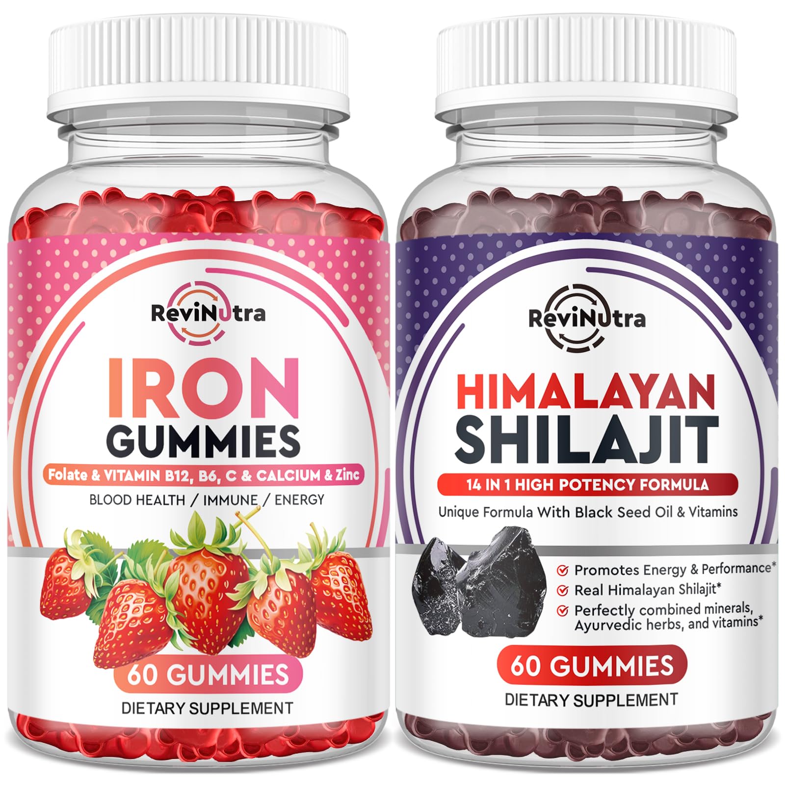 At ReviNutra, our mission is to empower individuals on their journey to better health with our thoughtfully curated dietary supplements. We believe that wellness is the cornerstone of a vibrant life, and we are passionate about delivering premium products that enhance your well-being. Your health and happiness are at the heart of what we do, which is why we prioritize quality and customer satisfaction. Thank you for trusting ReviNutra to support your wellness goals.DELICIOUS GUMMIES FOR THE WHOLE FAMILY - Just 2 convenient Iron gummies Everyone in your family will love our Strawberry-flavored gummies, which are easy to chew and have a pleasant taste for men, women, and children. Absorb into your system faster than with pills or capsules. If you're unhappy with your purchase, please contact us. 60 EXTRA STRENGTH GUMMIES: Discover the rejuvenating power of Himalayan shilajit gummies, a natural supplement that enhances energy, stamina, brain function, immune support, heart health, antioxidant protection, and digestion. It's a comprehensive solution for optimal health and vitality. BOOST ENERGY VITALITY: Our authentic Shilajit gummies provide a natural energy boost, helping combat fatigue and improve stamina. They support mitochondrial function, promoting efficient energy production and sustained vitality throughout your day, whether you're at work, on the go, or relaxing at home. Just take 2 gummies daily to experience enhanced vitality. LESS CONSTIPATION SIDE EFFECTS: This ultra premium vegan iron supplement is made from a unique ingredient called Ferrochel. Ferrochel chelated iron (ferrous bisglycinate) is better absorbed than most other iron supplements. This allows you to take a smaller dose than you would with cheaper synthetic iron pills. It's also easier on the stomach, reducing the chance of constipation and nausea. MAXIMUM BENEFIT FORMULA: Feel the power of our iron supplement gummies vitamins for women and men made with super potent iron with Zinc, Calcium, Folate, vitamins B6, B12, C, to help your body absorb the minerals it needs for daily function. These essential, high-potency gummies iron supplements help to enhance your body's natural energy levels to fight fatigue and weakness, giving you a sustained energy boost throughout the day.