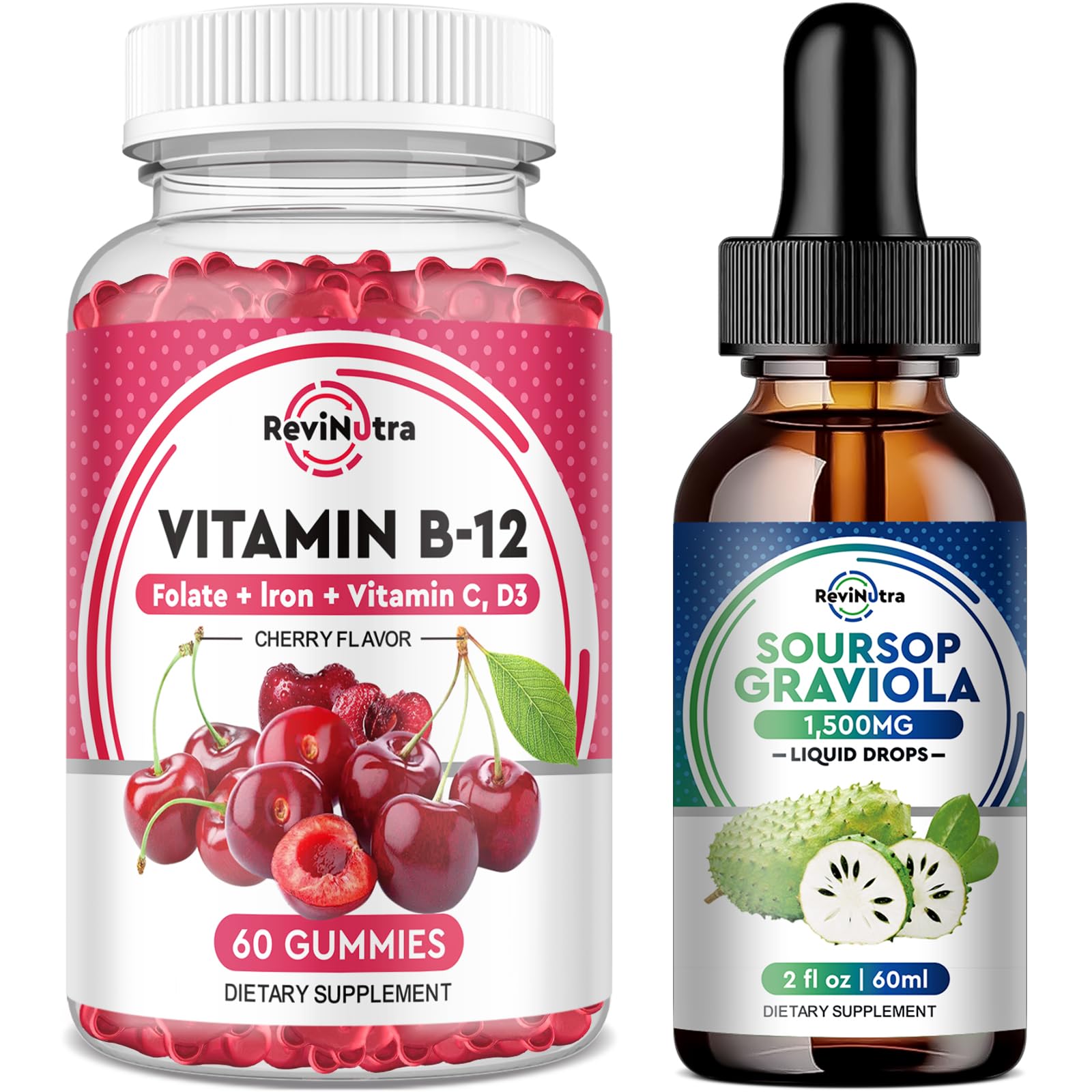 At ReviNutra, our mission is to empower individuals on their journey to better health with our thoughtfully curated dietary supplements. We believe that wellness is the cornerstone of a vibrant life, and we are passionate about delivering premium products that enhance your well-being. Your health and happiness are at the heart of what we do, which is why we prioritize quality and customer satisfaction. Thank you for trusting ReviNutra to support your wellness goals.DELICIOUS GUMMIES FOR THE WHOLE FAMILY - Just 2 convenient Iron gummies Everyone in your family will love our Strawberry-flavored gummies, which are easy to chew and have a pleasant taste for men, women, and children. Absorb into your system faster than with pills or capsules. If you're unhappy with your purchase, please contact us. WHAT IS SOURSOP: Organic soursop leaves (Graviola), from the Annona muricata tree, offers essential vitamins and minerals supporting immune function, gut health, and cell protection against free radicals. High in fiber and antioxidants, it aids digestion, regulates blood pressure, and supports liver and sleep health. 8 IN 1 EXTRA STRENGTH: Elevate your health with our soursop bitters liquid Supplement. Packed with Vitamin C, B1, B2, Polyphenols, Elderberry, and Zinc, this formula bolsters your immune system, enhances cell health, and promotes overall well-being. Feel vibrant and energetic every day. LESS CONSTIPATION SIDE EFFECTS: This ultra premium vegan iron supplement is made from a unique ingredient called Ferrochel. Ferrochel chelated iron (ferrous bisglycinate) is better absorbed than most other iron supplements. This allows you to take a smaller dose than you would with cheaper synthetic iron pills. It's also easier on the stomach, reducing the chance of constipation and nausea. MAXIMUM BENEFIT FORMULA: Feel the power of our iron supplement gummies vitamins for women and men made with super potent iron with Zinc, Calcium, Folate, vitamins B6, B12, C, to help your body absorb the minerals it needs for daily function. These essential, high-potency gummies iron supplements help to enhance your body's natural energy levels to fight fatigue and weakness, giving you a sustained energy boost throughout the day.