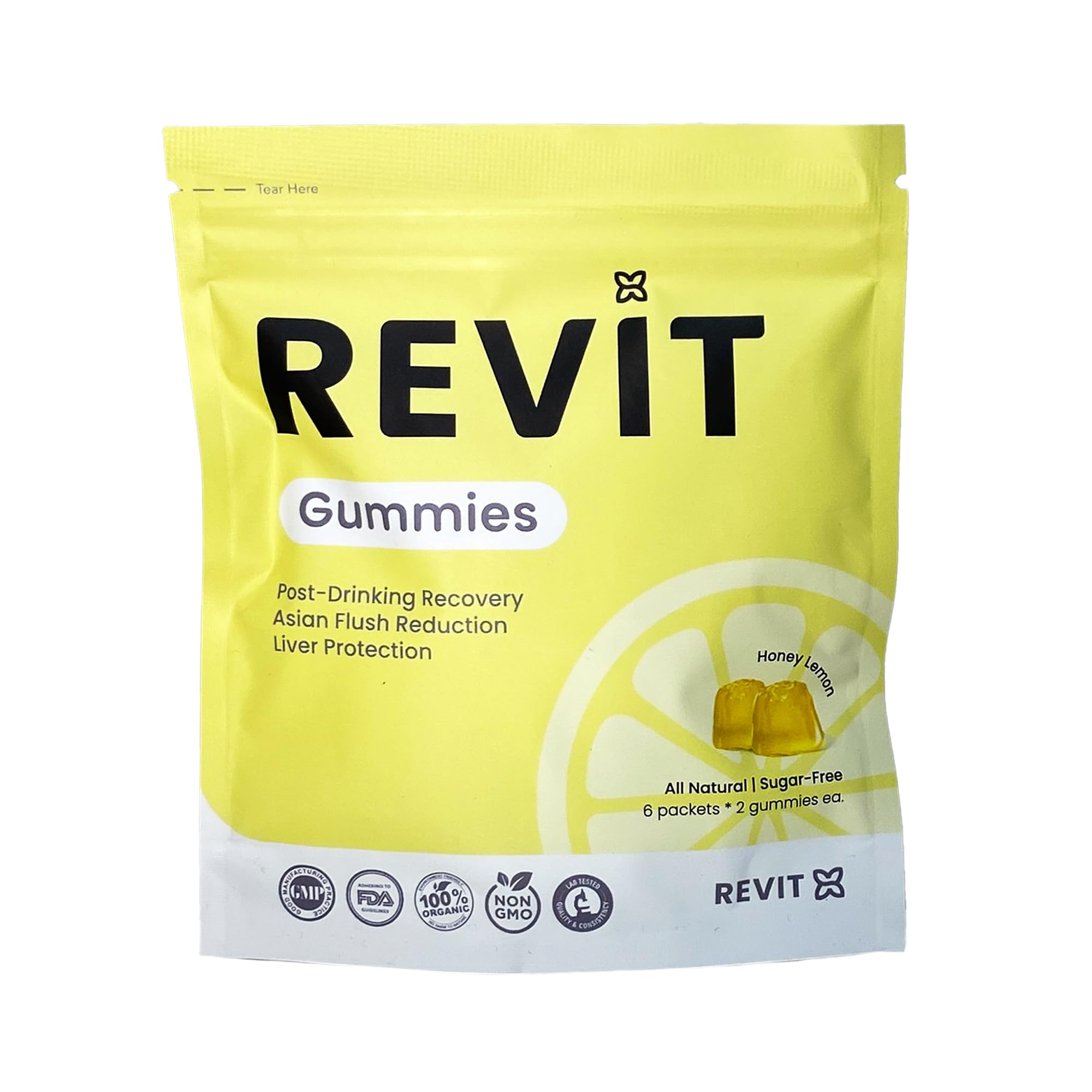Revit is Singapore's award-winning, all-natural recovery gummy, specially designed to support your body after a night of socializing. Packed with a high concentration of DHM (Dihydromyricetin), our gummies help accelerate alcohol metabolism, replenish essential nutrients, and reduce uncomfortable flushing, giving you the relief and recovery you need. Revit gummies combine innovation and convenience in a pocket-sized package. Each pack contains 6 servings (12 gummies total), providing you with a delicious honey-lemon flavor that's easy to carry and even easier to enjoy. With every bite, you're protecting your liver and promoting faster recovery with powerful antioxidants. Whether you're heading out for a night of fun or recovering the next day, Revit offers a scientifically-backed, convenient, and delightful way to feel your best.Award-Winning Recovery Gummy: Winner of the Best Recovery Supplement of 2023 2024 by APAC Insider, trusted by customers for its proven effectiveness. Top-rated alcohol recovery and liver support supplement. Delicious Honey-Lemon Flavor: Enjoy a tasty way to replenish essential nutrients and reduce discomfort after drinking. Flavored gummy, vitamin-packed, alcohol recovery supplement with great taste. Compact Pocket-Sized Package: Portable and convenient for travel, social events, or nights out. Ideal for on-the-go use, fits easily in your bag, travel essentials, or emergency recovery kit. All-Natural Formula: Made with 100 organic ingredients for a healthier recovery experience. Great for those seeking a natural solution, vegetarian-friendly, gluten-free gummy. High Concentration of DHM (Dihydromyricetin): Scientifically formulated to aid in alcohol metabolism and support faster recovery. Perfect for alcohol recovery, detox supplement, liver support, and relief kit.