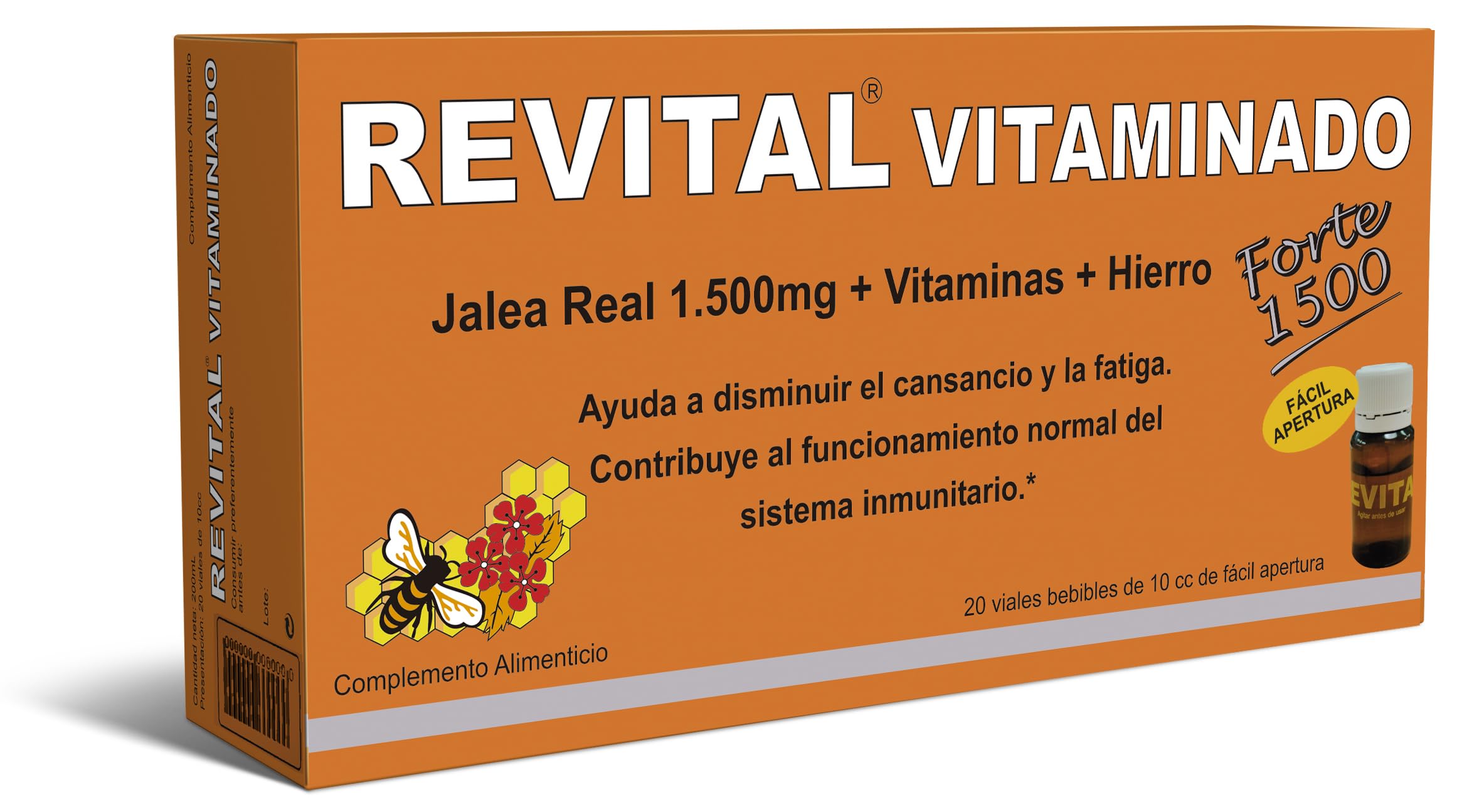 Formula with 1500 mg of royal jelly with vitamins that contribute to the normal function of the immune system (A, B6, B9, B12, C, D, and iron). Composition: Royal jelly (1500 mg), vitamins A, D, E, B1, B2, B3, B5, B6, B8, B9, B12, C, and iron. - Vitamins B2, B3, B5, B6, B9, B12, and iron help reduce tiredness and fatigue. - Vitamins A, B6, B9, B12, C, D, and iron contribute to the normal function of the immune system. - Vitamin B5 contributes to normal energy-yielding metabolism. Directions for use: It is recommended to take 1 bottle per day, preferably before breakfast. Presentation: 20 drinkable vials INGREDIENTS Royal jelly (1500 mg), vitamins A, D, E, B1, B2, B3, B5, B6, B8, B9, B12, C and ironProduct made in Spain. Brand with advertising recognition. With the quality and trust of Pharma OTC. Vitamin B5 contributes to normal energy-yielding metabolism. Vitamins A, B6, B9, B12, C, D, and iron contribute to the normal function of the immune system. Vitamins B2, B3, B5, B6, B9, B12, and iron help reduce tiredness and fatigue.Revital Vitaminé Forte - Formule avec 1500mg de Gelée Royale et Vitamines - 20 FlaconsDESCRIPTION DU PRODUIT DESCRIPTION DU PRODUIT Formule avec 1500 mg de gelée royale avec des vitamines qui contribuent au fonctionnement normal du système immunitaire (A, B6, B9, B12, C, D et le fer). Composition : gelée royale (1500 mg), vitamines A, D, E, B1, B2, B3, B5, B6, B8 B9, B12, C et fer. - Les vitamines B2, B3, B5, B6, B9, B12 et le fer aident à réduire la fatigue et la fatigue. - Les vitamines A, B6, B9, B12, C, D et le fer contribuent au fonctionnement normal du système immunitaire. - La vitamine B5 contribue au métabolisme énergétique normal. Mode d'emploi : il est recommandé d'ingérer 1 flacon par jour, de préférence avant le petit déjeuner. Présentation : 20 flacons à boire INGRÉDIENTS Gelée royale (1 500 mg), vitamines A, D, E, B1, B2, B3, B5, B6, B8 B9, B12, C et ferProduit fabriqué en Espagne. Marque avec reconnaissance publicitaire. Avec la qualité et la confiance de Pharma OTC. La vitamine B5 contribue au métabolisme énergétique normal. Les vitamines A, B6, B9, B12, C, D et le fer contribuent au fonctionnement normal du système immunitaire. Les vitamines B2, B3, B5, B6, B9, B12 et le fer aident à réduire la fatigue et la fatigue.