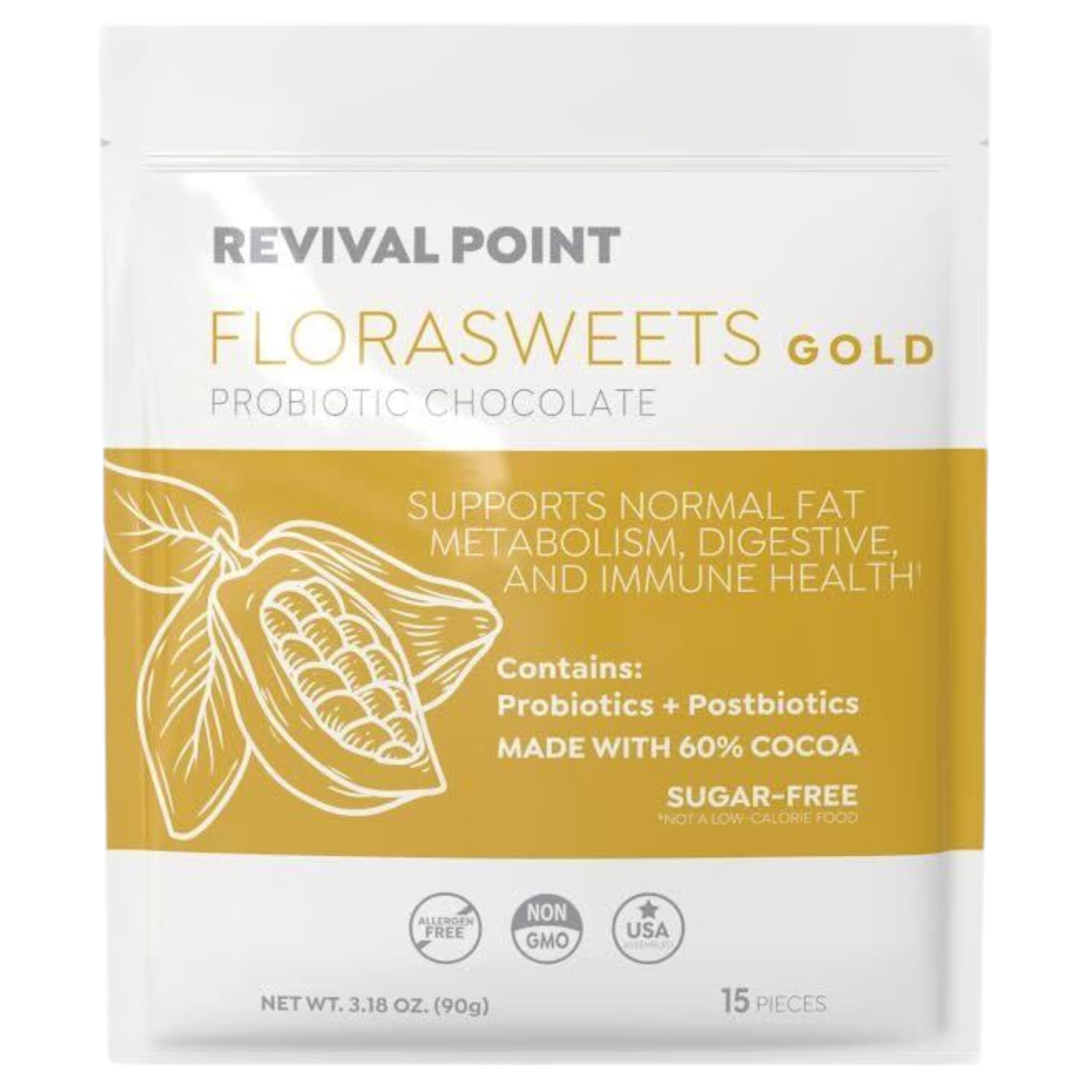 Revival Point Florasweets Gold Chocolate Bites with Probiotic + Postbiotic Stains DE111 & BPL1 - Indivally Wrapped - Supports Digestive & Gut Health Bacillus subtilis (1)