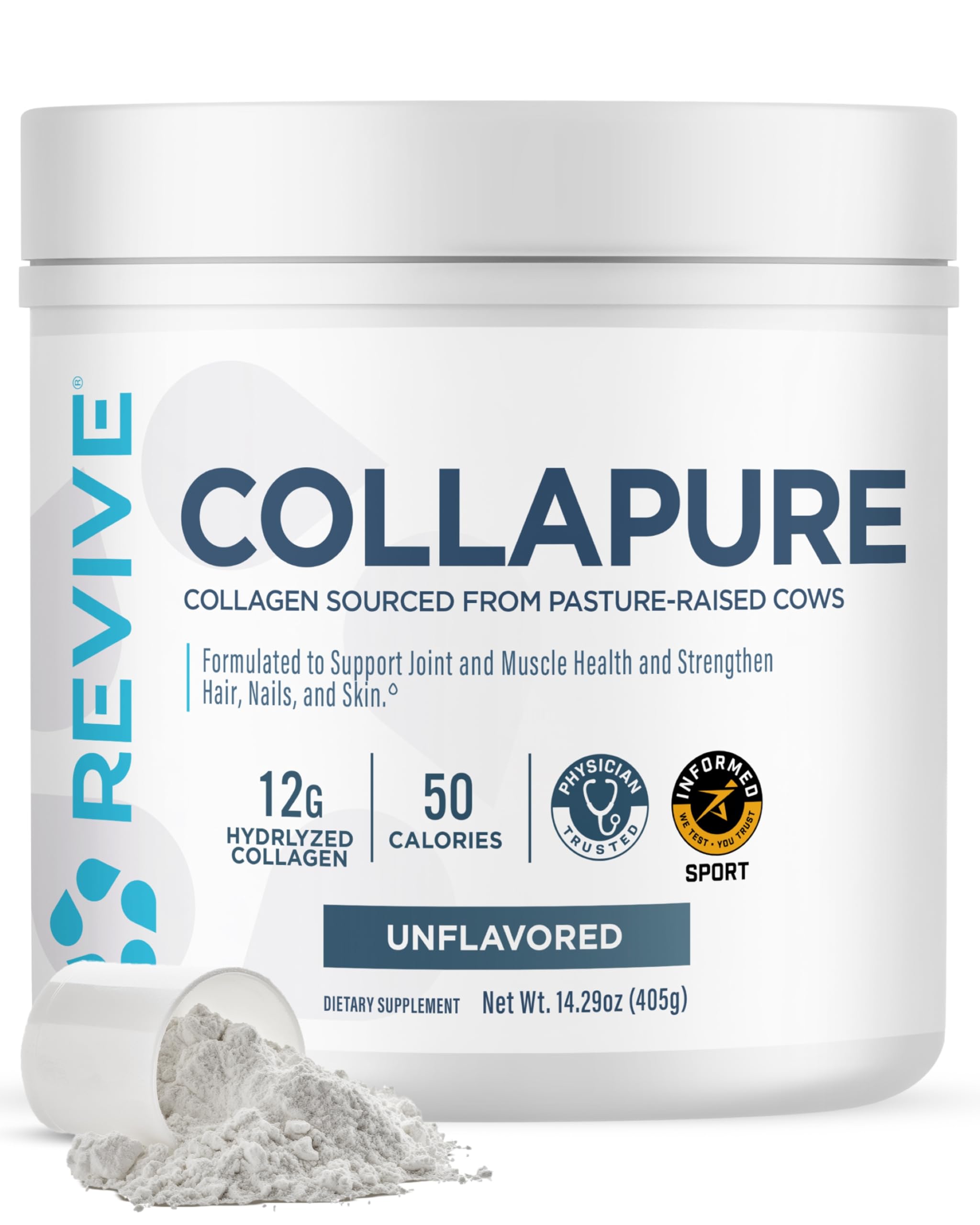 Experience the Difference: The mission here at Revive MD begins with you. Our vision is to encourage, educate, and empower you to harness the powers of nature to better your health. Through the art of supplementation, we strive to help you experience the highest quality of life. Everything You Need – Nothing You Don't: Our formulas only consist of effective ingredients, no artificial filler or dye. Collapure from Revive is doctor-formulated and made with natural ingredients, making it a great choice for anyone looking for a natural way to support their overall health and well-being. Spark Healthy Habits: The best time to take collagen peptides is in the morning on an empty stomach or at night before bed. Mix one scoop with a glass of water or incorporate it into your morning coffee or smoothie to maximize absorption. Key Ingredients: Collapure is made with grass-fed collagen sourced from pasture-raised cows, providing Type I and Type III collagen, the naturally occurring major components of skin, hair, nails, bones and tendons. Each serving contains 12g of hydrolyzed collagen, ensuring better absorption and maximum benefits. Support Healthy Hair and Nails: Collapure from ReviveMD is formulated to support joint and muscle health while strengthening hair, nails, skin and bones. Collapure works to support youthful-looking skin and fewer wrinkles, joint pain relief and better mobility, strong bones, and improved digestion. 30 servings. Unflavored.