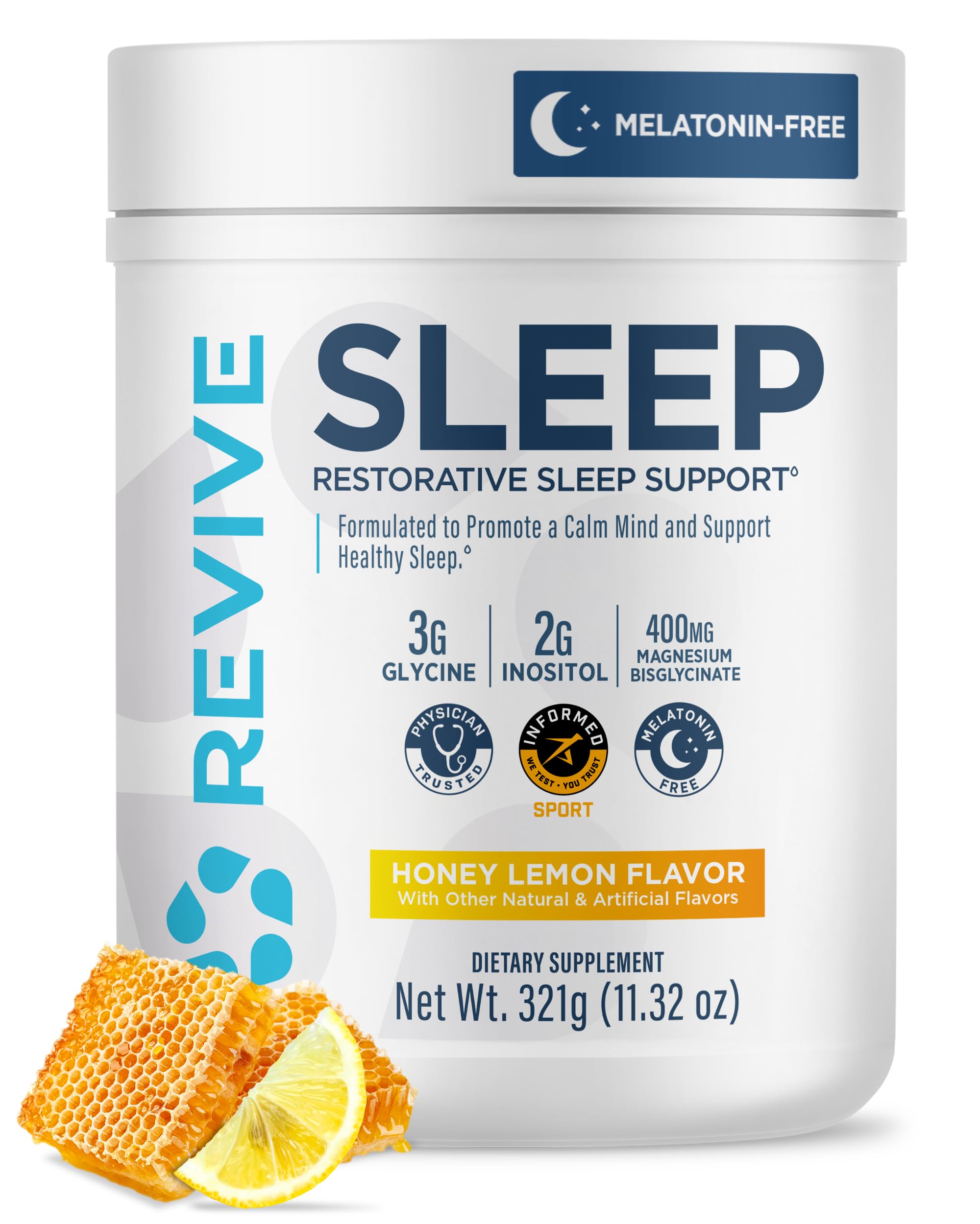 Experience the Difference: The mission here at Revive MD begins with you. Our vision is to encourage, educate, and empower you to harness the powers of nature to better your health. Through the art of supplementation, we strive to help you experience the highest quality of life. Everything You Need – Nothing You Don't: Our formulas only consist of effective ingredients, no artificial filler or dye. Sleep Support is vegan-friendly, gluten-free, and soy-free, making it a great choice for anyone looking for a natural way to support their overall health and wellbeing. Spark Healthy Habits: Start with 1 serving to assess effects with the choice to increase to 2 servings if needed. Take in the evening about 30 minutes prior to optimal sleep time to maximize relaxation and sleep benefits. Key Ingredients: Glycine promotes faster sleep onset by lowering body temperature, a key step in the body's progression into sleep, while Inositol may potentially improve mood and emotional well-being, and Magnesium and L-theanine collaborate to reduce mental tension, helping your body unwind before sleep. Find Deep, Restorative Sleep: Revive Sleep is an innovative, melatonin-free sleep support supplement designed to optimize sleep quality and improve nighttime restfulness. This support supplement works with your body's natural processes to promote relaxation, reduce how long it takes to fall asleep, and enhance overall sleep efficiency. Flavor: Honey Lemon. 11.32 oz, 30 servings.