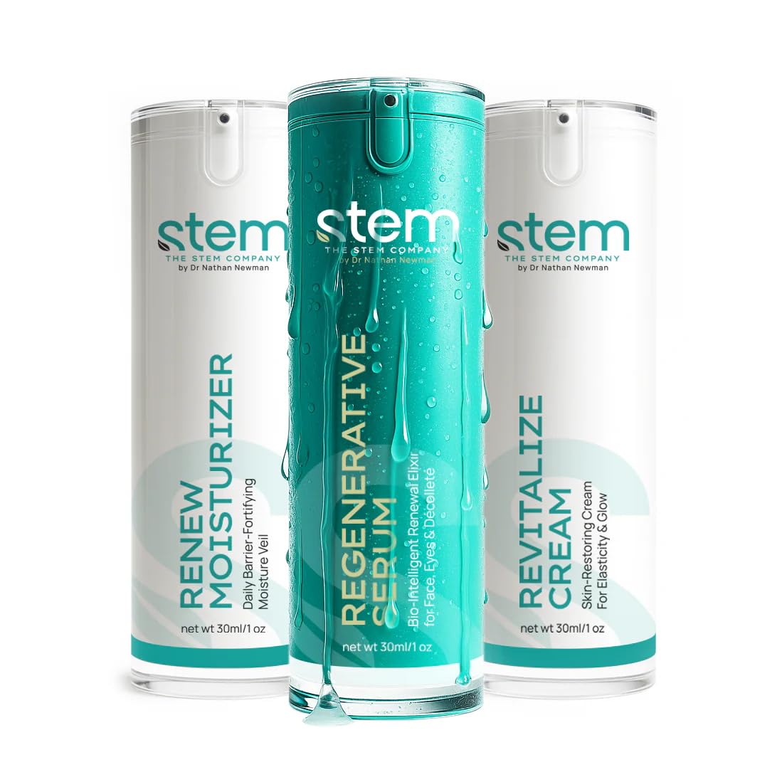 Experience the complete STEM Natural Intelligence ReVive Ritual Skincare Bundle—an advanced 3-step system combining the ReNew Day Cream, ReGenerative Serum, and ReVitalize Night Cream to deliver balance, hydration, and radiance from morning to night. Created by Dr. Nathan Newman and backed by years of innovation, this collection blends science and nature's wisdom to mentor your skin's natural functions for a healthy, glowing look. Begin your day with the ReNew Day Cream, a lightweight formula infused with antioxidants and proprietary consortia factors that absorb quickly to help maintain your skin's natural moisture barrier. Ideal for all skin types, this luxury face moisturizer for women and men leaves the skin feeling soft, smooth, and refreshed throughout the day. Follow with the ReGenerative Serum, a powerful infusion of plant stem cell technology, peptides, and polypeptides designed to nurture your skin's foundation. Its hydrating properties support smoother texture and a more vibrant appearance, bringing modern science and nature's intelligence together in perfect harmony. Complete your nightly routine with the ReVitalize Night Cream, a deeply moisturizing formula enriched with UCFx-F and UCFx-S plant stem cell extracts that work as an overnight face mask cream, helping your skin stay supple and rejuvenated by morning. Together, these premium facial skin care products create a seamless ritual that restores balance, enhances hydration, and elevates your daily self-care experience. The ReVive Ritual Skincare Bundle transforms your skincare routine into a luxurious experience designed to reveal your skin's natural vitality and brilliance every day.LUXURY SKINCARE SET: Together, these premium facial skin care products create a simple, effective routine that hydrates by day, rejuvenates by night, and helps your skin look and feel its best every day. OVERNIGHT RESTORATION: ReVitalize Night Cream works as an overnight face mask cream, featuring UCFx-F and UCFx-S plant stem cell extracts that support the skin's natural renewal process. Wake up to skin that feels soft, balanced, and refreshed. REGENERATIVE SERUM: STEM's ReGenerative Serum combines plant stem cell technology with peptides and polypeptides to nurture the skin's foundation. It helps smooth texture and supports a vibrant, healthy-looking glow through deeply hydrating ingredients. DAYTIME HYDRATION: ReNew Day Cream delivers quick-absorbing moisture with antioxidants and consortia factors to help maintain your skin's natural barrier. Ideal for all skin types, this luxury face moisturizer for women and men supports soft, refreshed skin throughout the day. THE COMPLETE STEM EXPERIENCE: The ReVive Ritual Skincare Bundle unites ReNew Day Cream, ReGenerative Serum, and ReVitalize Night Cream in one luxurious 3-step system. Developed by Dr. Nathan Newman, this collection blends scientific innovation and natural intelligence for balanced, radiant skin.