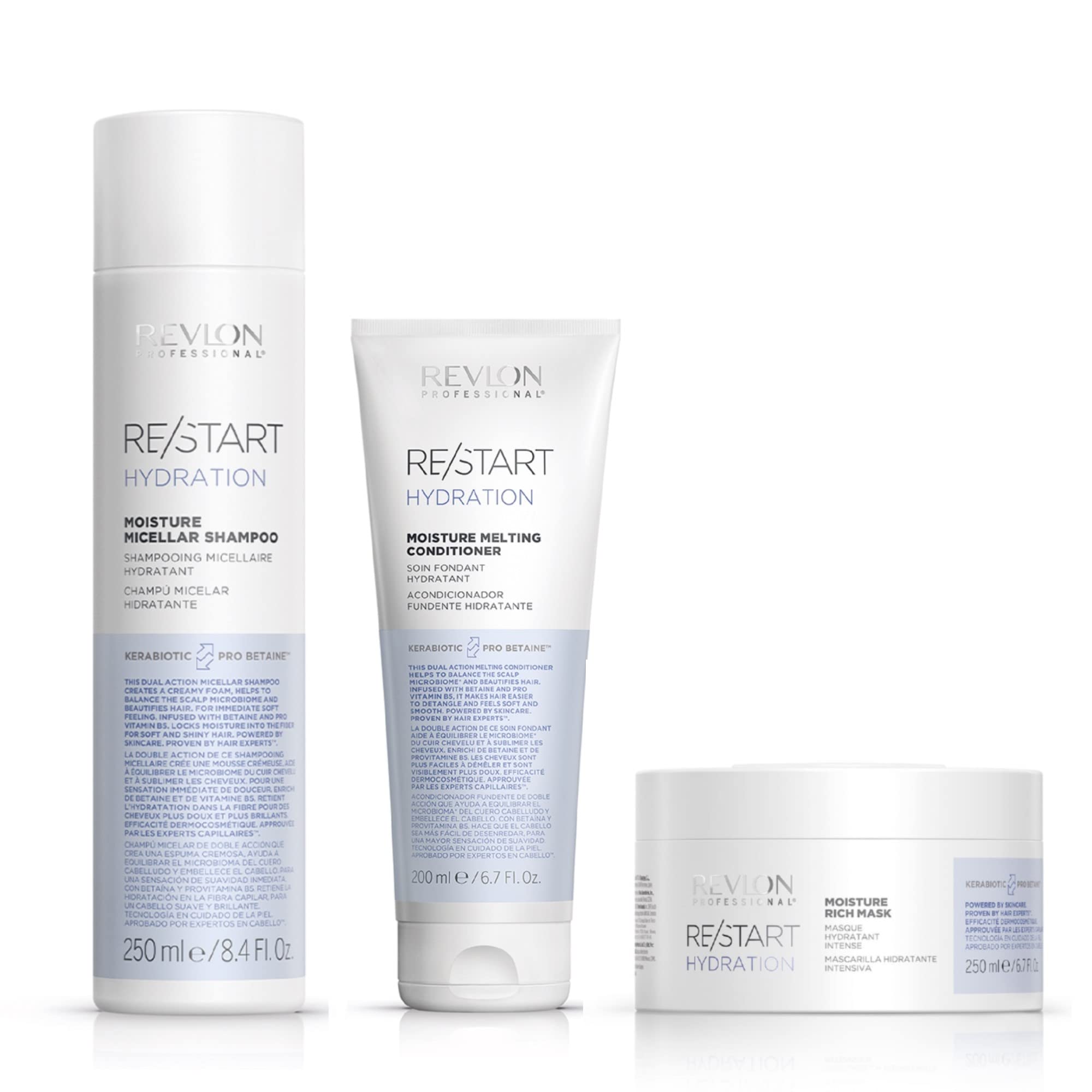 REVLON PROFESSIONAL RE/START Hydration Routine Shampoing Micellaire Hydratant 250 ml + Apr s-shampoing Soin Fondant Hydratant 200 ml + Masque Hydratant 250 ml pour cheveux secs et ab m s