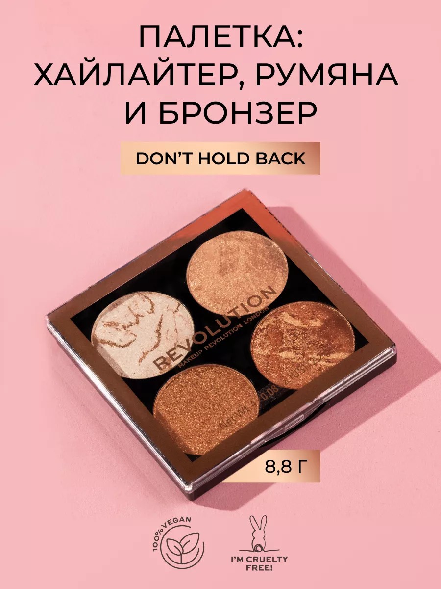 Безусловный хит коллекции! Хайлайтер для лица сухой 4 в 1 REVOLUTION MAKEUP - это цвет и сияние в квадрате! Палетка хайлайтеров для лица - для эффекта «поцелованной солнцем» светящейся кожи.