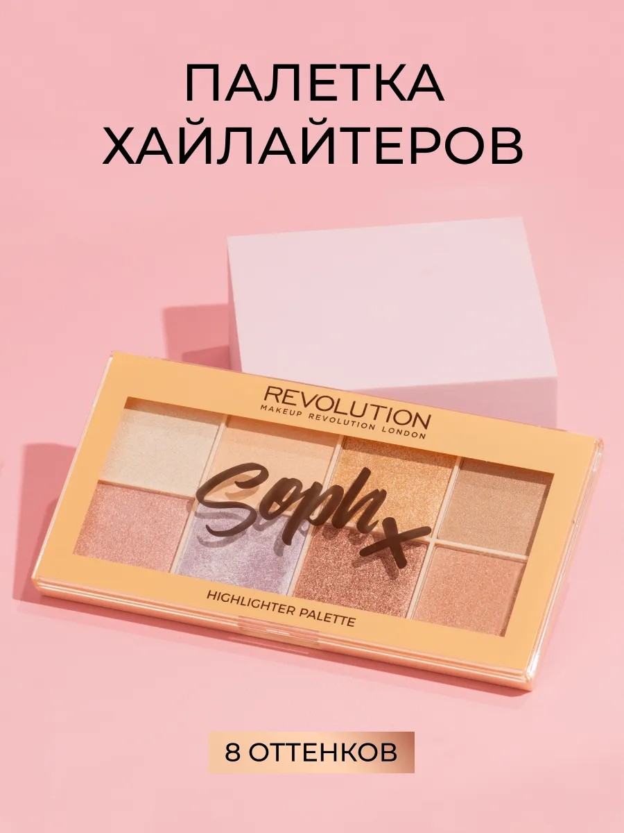 Хайлайтер для лица Soph Highlighter Palette - коллаборация британского бренда Revolution Makeup совместно с блогером Sophdoesnails. Если вы в поисках палетки хайлайтеров которая станет идеальным дополнением к любому образу вы на верном пути. Здесь есть всё от натурального свечения здоровой кожи до ослепительного блеска который видно из космоса. Мы собрали 8 различных оттенков с пудровой текстурой которые можно использовать по отдельности на разных зонах лица или смешивать между собой чтобы добиться желаемой степени насыщенности и подходящего вам тона. Оттенки выполнены на любой вкус и даже самые темные из них достаточно ходовые, поскольку могут использоваться в качестве теней. Хайлайтеры имеют разные текстуры. Прессованные выглядят чуть мягче и нежнее, они спокойнее и отлично подходят для дневного мейка. Запеченные, в свою очередь, более насыщенные и станут отличным завершением вечернего образа. Пигментация высокая, без пятен на коже.