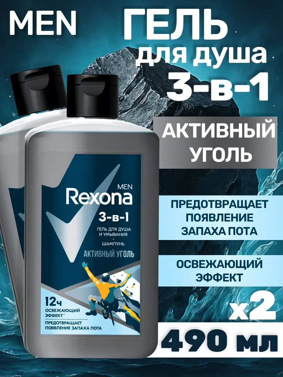 Rexona Гель для душа мужской 3 в 1 с углем 490 мл, 2 шт