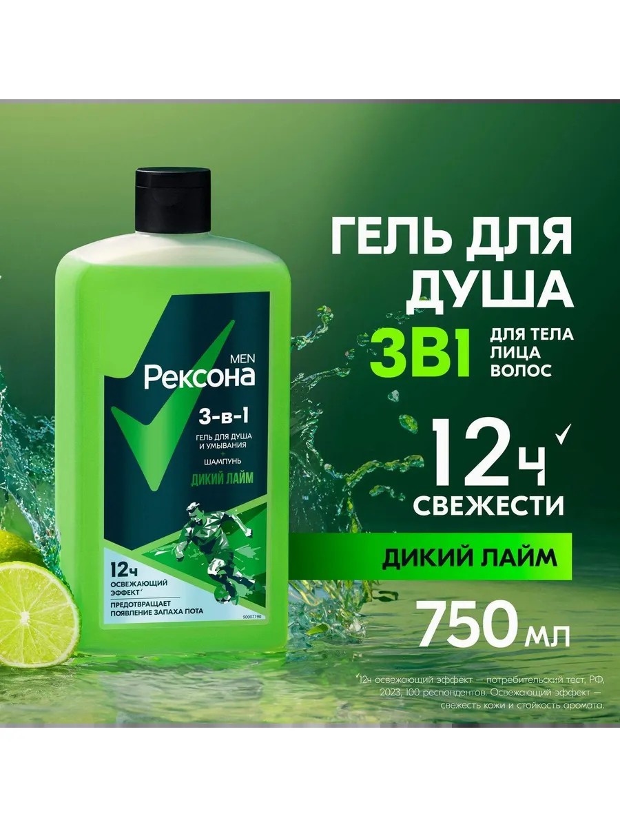 РЕКСОНА MEN Гель для душа, умывания и шампунь 3в1 Дикий лайм 750мл.