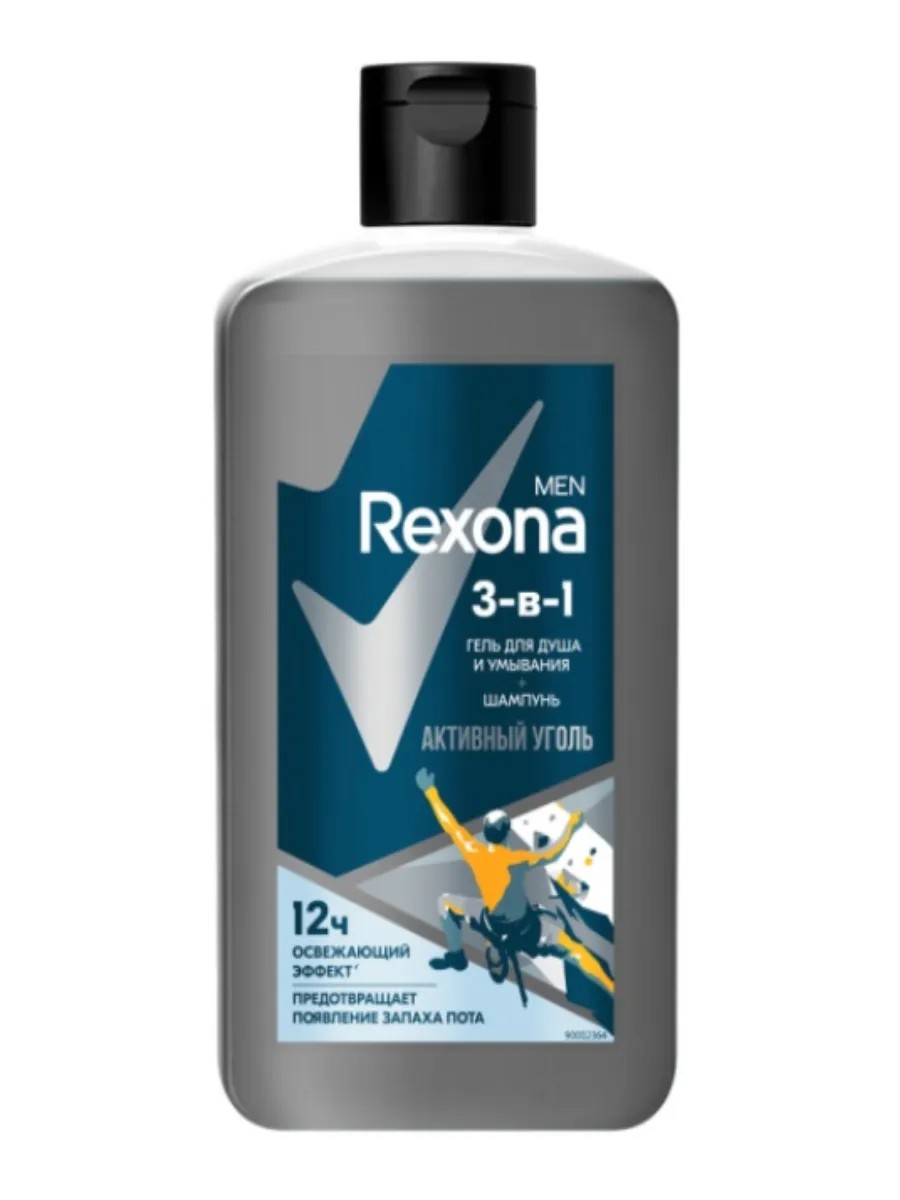 Men 3-in-1 Shower Gel and Shampoo with Active Charcoal, 490 ml. To look great all day long and avoid filling your bathroom with a million tubes and bottles, try Rexona's new Men 3-in-1 shower gel, cleanser, and shampoo with Active Charcoal.