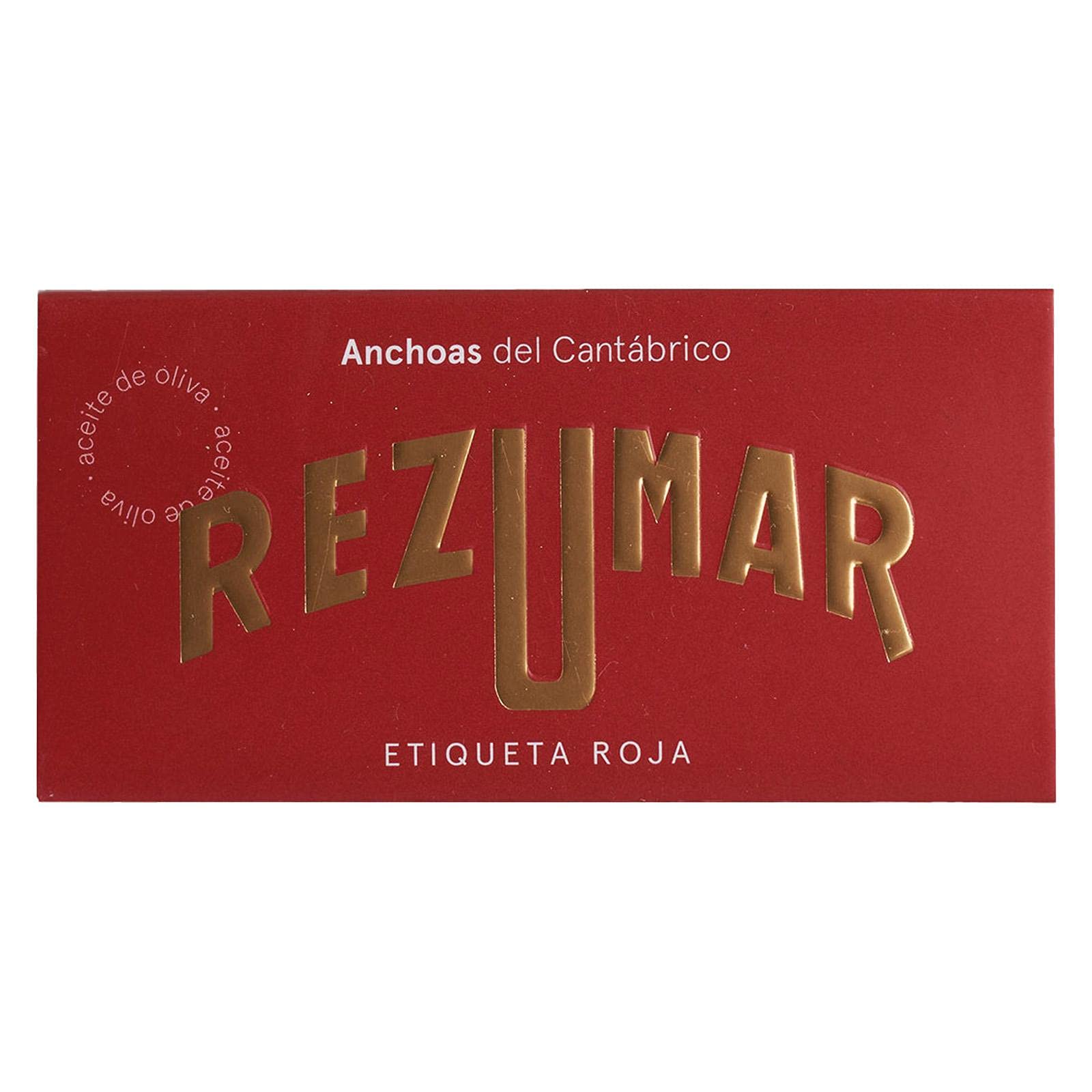 Cantabrian anchovy fillets in olive oil. Produced in semi-preserved form and with a lower salt concentration than common anchovies, the consistency is meaty and of high quality. Aged in barrels for one year at room temperature. Rezumar - Red Label, produced entirely by hand and using traditional methods without preservatives, 100 Cantabrian, 100 artisanal.Contains approximately 10 fillets. Rezumar - Red Label, produced entirely by hand and using traditional methods without preservatives, 100 Cantabrian, 100 artisanal. Aged in barrels for one year at room temperature. Produced in semi-preserved form and with a lower salt concentration than common anchovies, the consistency is meaty and of high quality. Anchovy fillets from the Cantabrian Sea in olive oil. Filets d'anchois de la mer Cantabrique à l'huile d'olive. Produit en semi-conserve et avec une concentration en sel plus faible que les anchois communs, la consistance est charnue et de haute qualité. Vieilli en fût pendant un an à température ambiante. Rezumar - Label Rouge, production entièrement manuelle et avec des méthodes traditionnelles sans conservateurs, 100 Cantabrique 100 artisanale.Contient environ 10 filets. Rezumar - Label Rouge, production entièrement manuelle et avec des méthodes traditionnelles sans conservateurs, 100 Cantabrique 100 artisanale. Vieilli en fût pendant un an à température ambiante. Produit en semi-conserve et avec une concentration en sel plus faible que les anchois communs, la consistance est charnue et de haute qualité. Filets d'anchois de la mer Cantabrique à l'huile d'olive.