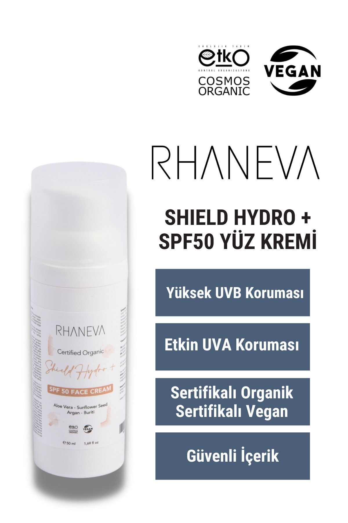 Enriched with organic aloe vera, sunflower seed, argan and buriti oils, which contain powerful antioxidants that protect the skin against free radicals and UV damage, SHIELD HYDRO SPF 50 Broad Spectrum Sunscreen effectively protects you from the sun all day long and provides your skin with the care it needs. With its Aloe Vera base, it quickly penetrates the skin and balances the skin's natural pH value. While it blocks UVB rays with its strong physical filter, it prevents UVA damage with its certified organic antioxidant content.