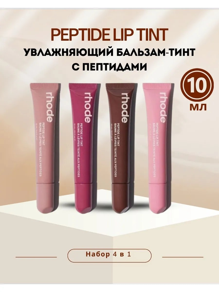 Набор блесков для губ в стиле RHODE включает 4 увлажняющих бальзама с оттенками: Toast (тауповый нюд), Raspberry Jelly (яркая малина), Salty tan (пыльная роза) и Ribbon (нежно-розовый).