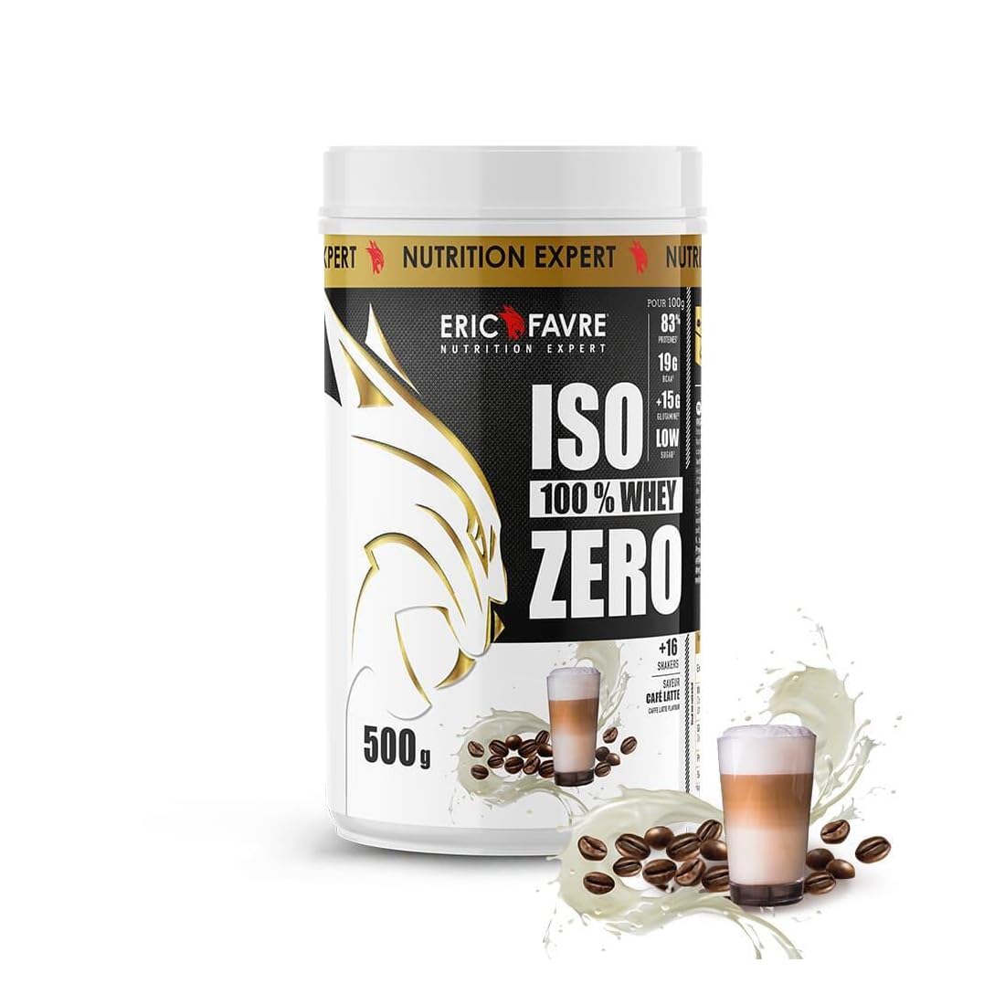 ISO ZERO is composed of 85 whey protein (WPI, WPC), one of the purest protein sources. This 85 protein comes solely from whey: no synthetic amino acids or collagen are added. Further proof of its quality is its chemical score of over 100. The Eric Favre laboratory selected it for its rapid absorption, which promotes muscle development indeed, protein contributes to increg muscle mass. Thanks to its extraction process, the protein is minimally denatured, ensuring excellent digestibility.ISO ZERO est constituée de 85 de protéines de whey (WPI, WPC), l'une des plus pures sources de protéines. Ces 85 de protéines proviennent uniquement de la whey : sans ajout d'acides aminés synthétiques, ni collagène. Preuve de sa quallité également, son indice chimique supérieur à 100. Le laboratoire Eric Favre l'a sélectionné pour son assimilation rapide permettant le développement musculaire, en effet, les protéines contribuent à augmenter la masse musculaire. De part son process d'extraction la protéine n'est que très peu dénaturée et lui assure une très bonne digestion.Éric Favre Iso Zero 100 Whey Protéine Café Latte 500g