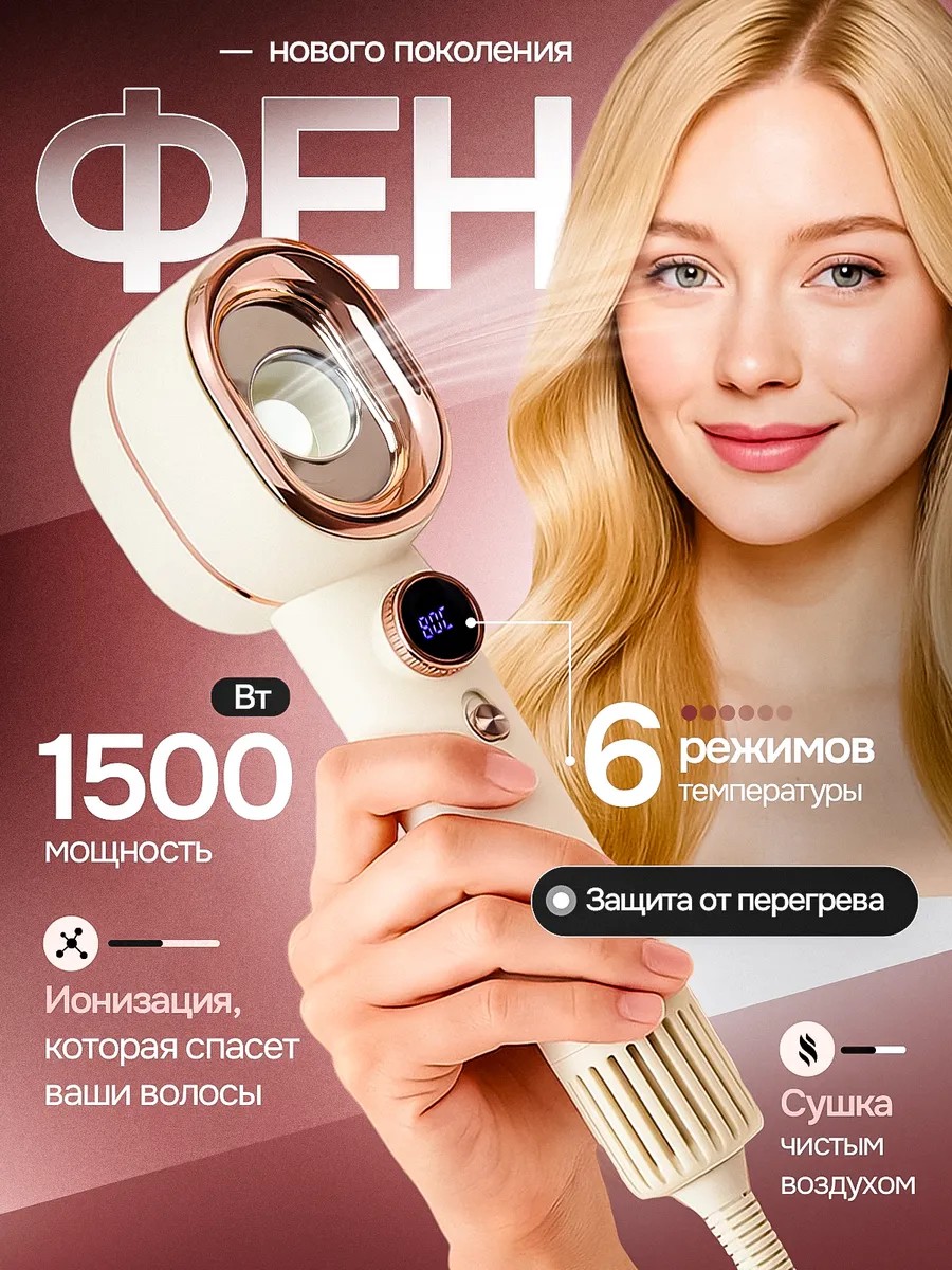 6 temperature levels and 2 speed modes for quick and gentle drying (heating up to 80 degrees). Blowing speed – up to 20 m/sec. Includes a directional flow attachment with a wide nozzle and a magnetic styler attachment for straightening and curling. This handheld hair dryer is a real find! The cord is 1.5 meters long. The stylish design and presentable packaging make it a great gift! A bestseller!