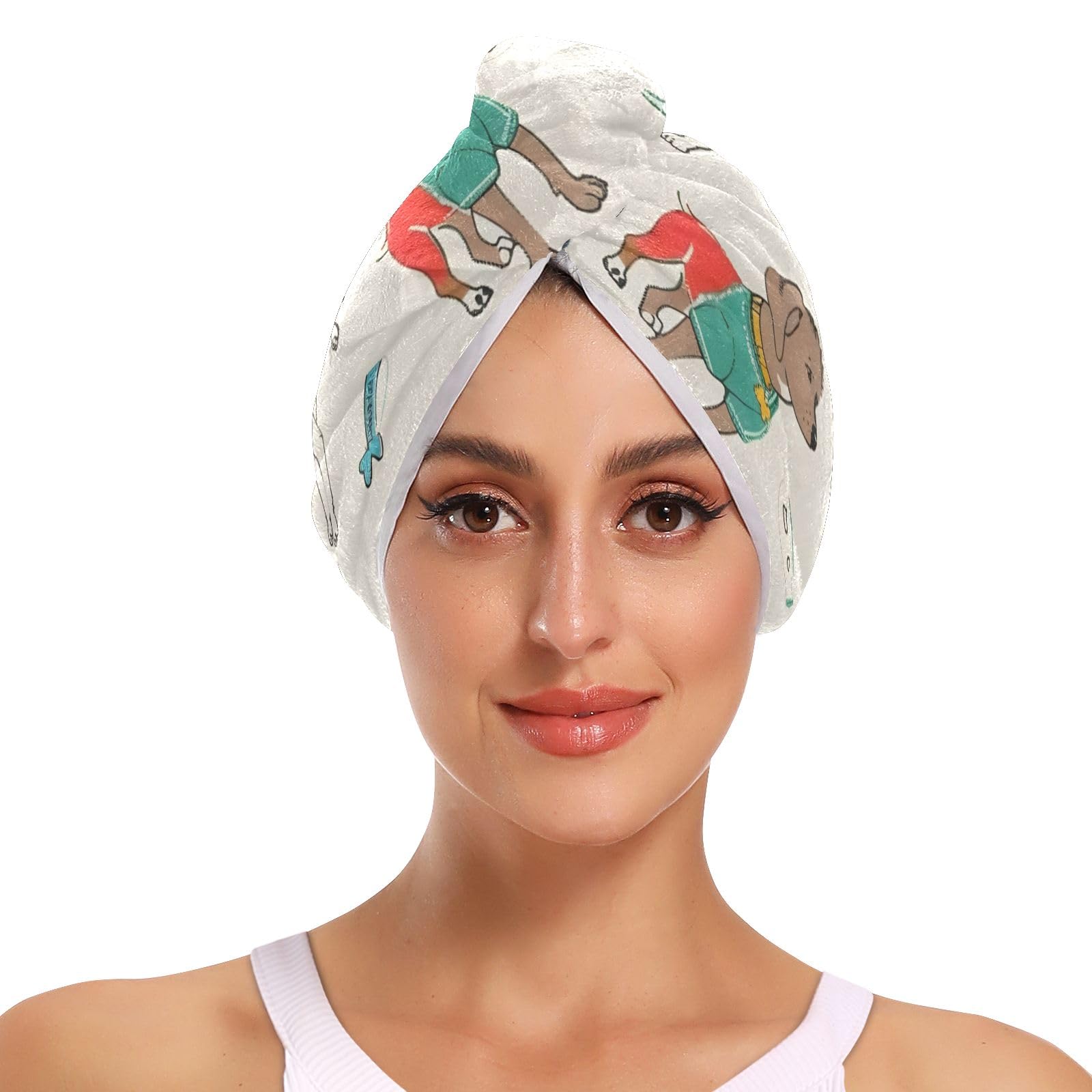 Hair Towel 2 Pack, Super Absorbent Hair Drying Towel Quick Dry Hair Turbans Head Towel with Button Twisty Wrap for Women Girls Features: High quality material, soft, breathable, light weight and sturdy to use for a long time. Our head towel is suitable for most head sizes and different hair types, such as curly, straight, thin, thick, longer hair. Perfect for teenager, girls and women who has fine hair. It helps reduce hair damage with super absorbent. Our hair drying towel will be a good helper to make you hair beautiful and silky. You can buy it for your families, friends or girlfriend as a present. They will love the present you selected carefully for them.Easy To Care: Machines washable and hand washable, no color fading. And not easily deform or shrink after long time use. Before the first time use, please wash them in cold water to make the floating color come off the fabric surface. Please use cold water without neutral detergent, do not rinse. Easy to Use: First, you need to wrap your hair in our hair drying cap after taking bath. Then, twist the long towel part back to hang the button. After that, you can do the makeup or other work, meanwhile, your hair will be dried. Applicable Occasions: Daily hair drying, hair care, skin care, facial cleansing, yoga, work, sports and other indoor and outdoor activities. Rapid Hair Drying Towel: The hair turban is made of absorbent polyester fabric which can gently absorb moisture from hair, helping it dry naturally and reducing frizz, avoiding hair damage. Especially for people who has finer hair and use the hairdryer as little as possible. Unique Hair Towel: Our coral fleece hair towel is super light, touch well, breathable and odorless. Printed with the cute and unique pattern. There are 2 packs included in package, then girls can share the hair turban with friend or sister.