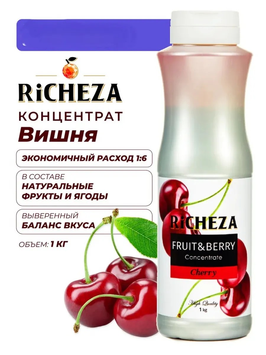 Концентрат на натуральной фруктово-ягодной основе для приготовления напитков RiCHEZA Вишня - это насыщенный терпко-сладкий вкус, спелый вишневый аромат и нежная текстура натурального вишневого пюре.