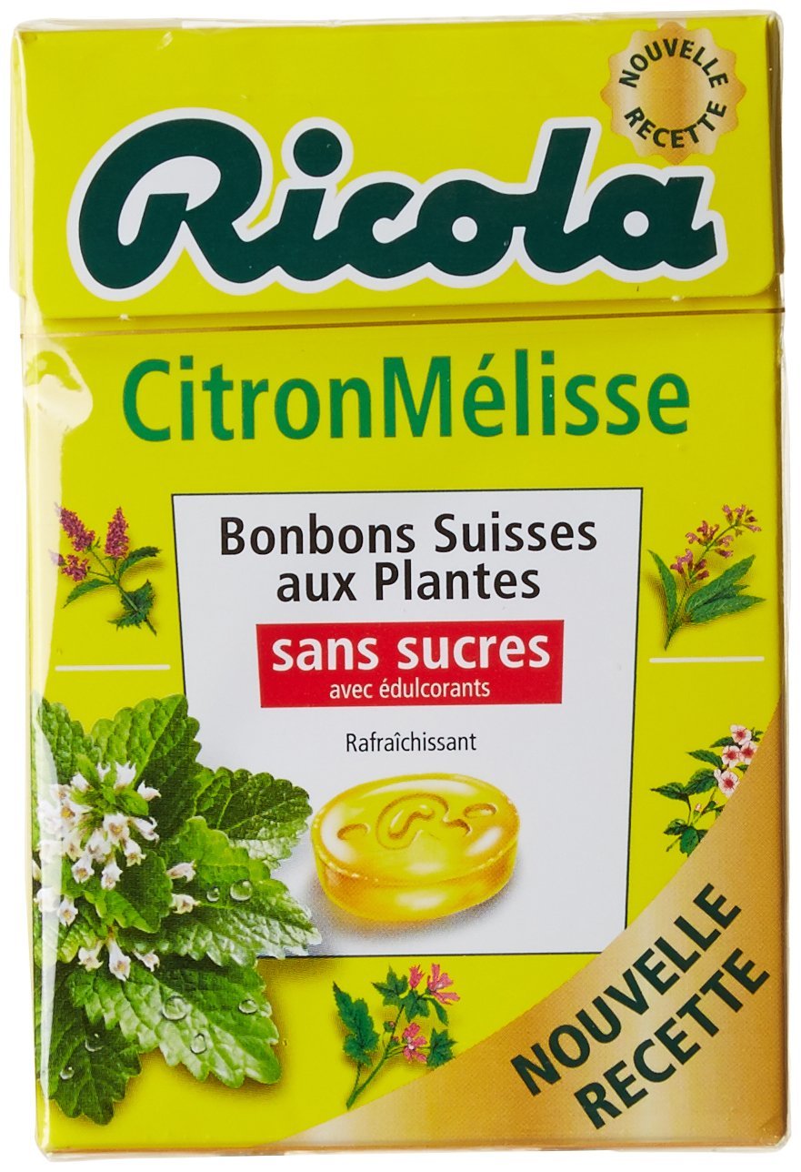 Ingredients: isomalt, acidifier (citric acid), extract (0.3 ) of lemon balm and 13-herb blend of ricola, natural citrus flavouring, sweeteners (sucralose, acesulfame-k), natural mint flavouring, menthol, colour (carotenoids).Ingrédients isomalt, acidifiant (acide citrique), extrait (0,3 ) de mélisse citronnelle et du mélange de 13 plantes ricola, arôme naturel d'agrumes, édulcorants (sucralose, acésulfame-k), arôme naturel de menthes, menthol, colorant (caroténoïdes).Ricola Bonbons Suisses aux Plantes Citron Mélisse Sucralose 50 g - Lot de 10