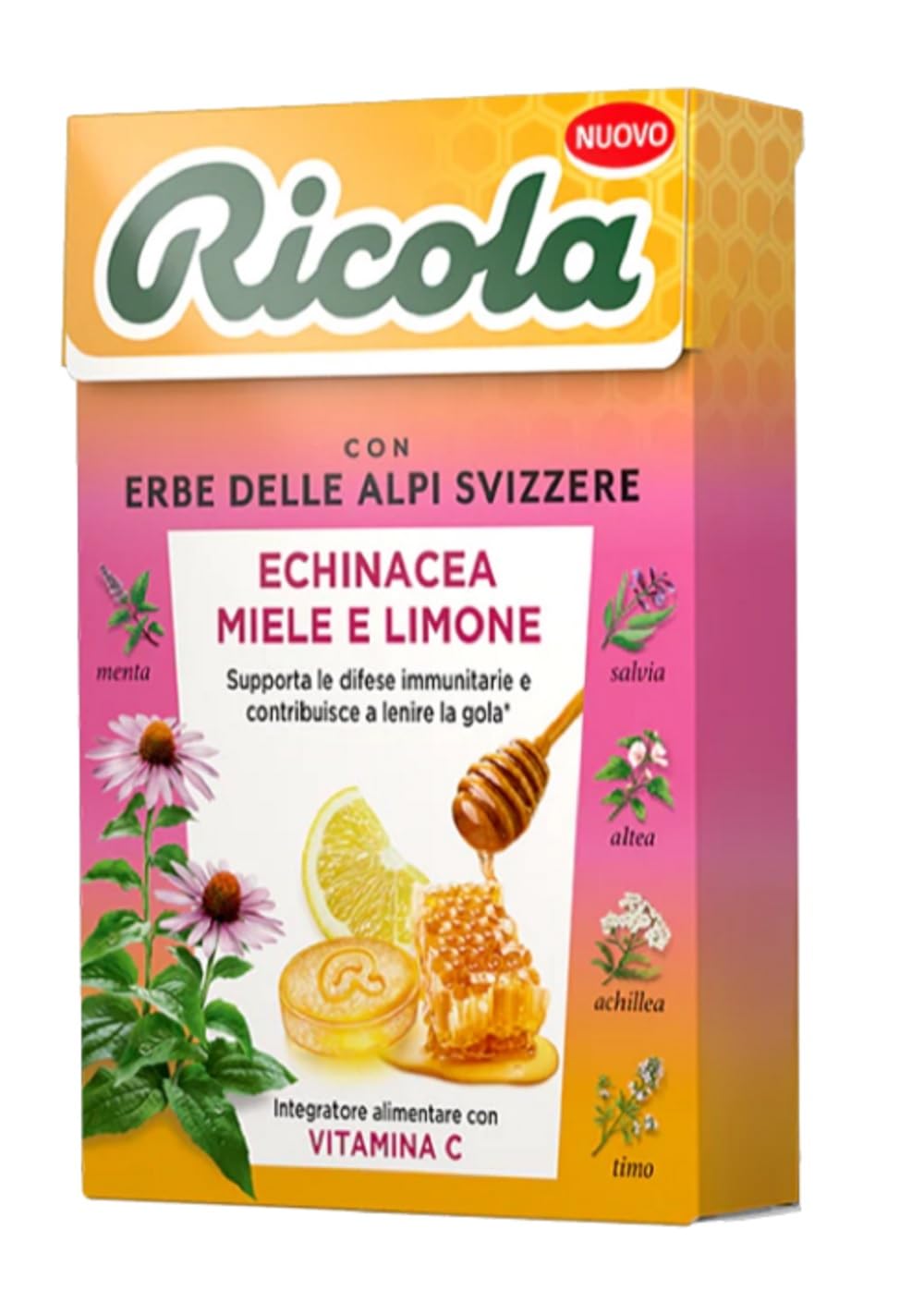 RICOLA – Ricola 13 Herb Hard Candies – Gluten-Free – Echinacea, Honey Lemon – 20 x 50g packs – Ricola Echinacea Honey Lemon combines the unique taste of 13 herbs with the beneficial effects of carefully selected natural ingredients. It contains natural echinacea purpurea extract, precious fair trade honey, and lemon. It's a candy, but at the same time, it contains vitamin C and contributes to the normal function of the immune system. Ingredients: Sugar, glucose syrup, honey (5.2 ), natural flavorings, extracts (0.8 ) of Echinacea purpurea, lemon balm, and Ricola herbal blend (plantain, marshmallow, thyme, sage, lady's mantle, elderflower, primrose, yarrow, speedwell, mallow, horehound), vitamin C, concentrated lemon juice (0.2 ), acids (citric acid, malic acid), mint essential oil, peppermint essential oil, menthol, coating agent (gum arabic). Recommended daily intake: 5 lozenges to dissolve in the mouth. Each lozenge (2.5 g) contains 4 mg of Echinacea purpurea, 19 of the recommended daily intake of vitamin C, and 2.0 mg of menthol. Do not exceed the recommended daily intake. It is important to follow a varied and balanced diet and lead a healthy lifestyle. Keep out of reach of children under three years old. Nutritional information: Recommended daily intake: 5 lozenges - Vitamin C 75 mg (covers 94 of the recommended daily intake) - Menthol: 80 mg per 100 g INGREDIENTS Sugar, glucose syrup, honey (5.2 ), natural flavorings, extracts (0.8 ) of Echinacea purpurea, lemon balm, and Ricola herbal blend (plantain, marshmallow, thyme, sage, lady's mantle, elderflower, primrose, yarrow, speedwell, mallow, horehound), vitamin C, lemon juice concentrate (0.2 ), acids (citric acid, malic acid), peppermint oil, menthol, coating agent (rubber arabic) DIRECTIONS Dissolve 5 lozenges in the mouth daily. See moreRicola - Bonbons aux 13 Herbes Ricola - Sans gluten - Echinacée Miel et Citron - 20 étuis de 50 gDESCRIPTION DU PRODUIT DESCRIPTION DU PRODUIT Ricola – Bonbons durs aux 13 Herbes Ricola – Sans gluten – Échinacée miel et citron – 20 étuis de 50 g – Ricola Echinacea Miele et Citron combine le goût inimitable des 13 herbes à l'effet bénéfique des ingrédients naturels soigneusement sélectionnés. Il contient en effet l'extrait naturel d'échinacea purpurea, le précieux miel du commerce équitable et le citron. C'est un bonbon mais en même temps contient de la vitamine C et contribue au fonctionnement du système immunitaire. Ingrédients : sucre, sirop de glucose, miel (5,2 ), arômes naturels, extraits (0,8 ) d'Echinacea Purpurea, mélisse et du mélange d'herbes Ricola (plantain, altéa, thym, sauge, alchemille, sureau, primevre, achillée, véronique, mauve, marrube), vitamine C, concentré de Jus de citron (0,2 ), acidifiants (acide citrique, acide malique), huile essentielle de menthe, huile essentielle de menthe poivrée, menthol, agent de revêtement (gomme arabique). Dose quotidienne recommandée : 5 bonbons à dissoudre dans la bouche. Chaque bonbon (2,5 g) contient 4 mg d'Echinacea purpurea, 19 de la dose quotidienne recommandée de vitamine C et 2,0 mg de menthol. Ne pas dépasser la dose quotidienne recommandée. Il est important de suivre une alimentation variée et équilibrée et de mener un mode de vie sain. Le produit doit être maintenu hors de portée des enfants de moins de trois ans - Informations nutritionnelles : dose quotidienne recommandée : 5 bonbons - Vitamine C 75 mg Couvre le dosage quotidien recommandé à 94 - Menthol : 80 mg pour 100 g INGRÉDIENTS Sucre, sirop de glucose, miel (5,2 ), arômes naturels, extraits (0,8 ) d'Echinacea Purpurea, mélisse et du mélange d'herbes Ricola (plantain, altéa, thym, sauge, alchemille, sureau, primevère, achillée, véronique, mauve, marrube), vitamine C, concentré de jus de citron (00) ,2 ), acidifiants (acide citrique, acide malique), huile essentielle de menthe, huile essentielle de menthe, menthol, agent de revêtement (caoutchouc arabique) MODE D'EMPLOI Dissoudre 5 bonbons dans la bouche par jour. Voir plus