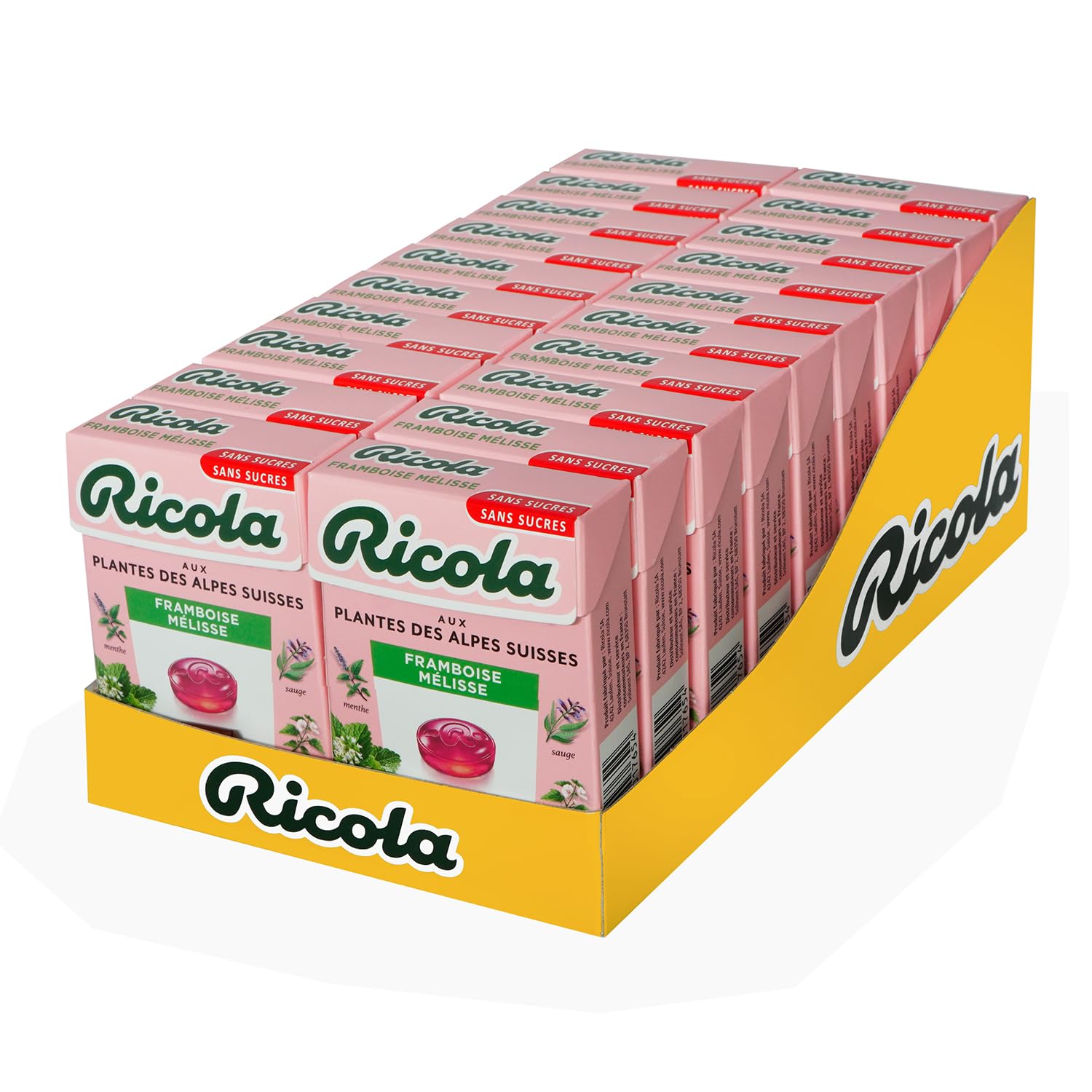 Don't bother looking for the Ricola candy recipe. It's a secret. Thirteen plants go into its composition, defined in 1940 by Ricola's founder, Emil Richterich. Since then, the recipe has never changed, even though it has gradually been enriched with new flavors. Sugar-free, Ricola candies are nonetheless very tasty, with their delicate and balanced flavor. 50g box INGREDIENTS Sweetener (isomalt), acids (citric acid, malic acid), raspberry juice concentrate (0.6 ), lemon balm extract (0.5 ) and Ricola's blend of 13 plants, natural flavorings, color concentrates (sweet potato, carrot), sweetener (steviol glycosides from Stevia), peppermint essential oil, mint essential oil, menthol. SAFETY WARNING Excessive consumption may have a laxative effect. See moreRicola - 20 Boîtes de 50g -Bonbons aux Plantes Suisses - Parfum Framboise Mélisse - Rafraîchissant - Sans SucresDESCRIPTION DU PRODUIT DESCRIPTION DU PRODUIT Ne cherchez pas la recette du bonbon Ricola. Elle est secrète . Treize plantes entrent dans sa composition, définie en 1940 par le fondateur de Ricola, Emil Richterich. Depuis, la recette n'a jamais varié, même si elle s'est enrichie progressivement de nouveaux parfums. Zéro sucre, les bonbons Ricola n'en restent pas moins très savoureux, avec leur goût délicat et équilibré . Boîte de 50g INGRÉDIENTS Édulcorant (isomalt), acidifiants (acide citrique, acide malique), concentré de jus de framboise (0,6 ), extrait (0,5 ) de mélisse citronnelle et du mélange de 13 plantes Ricola, arômes naturels, concentrés-couleur (patate douce, carotte), édulcorant (glycosides de stéviol issus de Stevia), huile essentielle de menthe poivrée, huile essentielle de menthe, menthol. AVERTISSEMENT DE SÉCURITÉ Une consommation excessive peut avoir des effets laxatifs. Voir plus