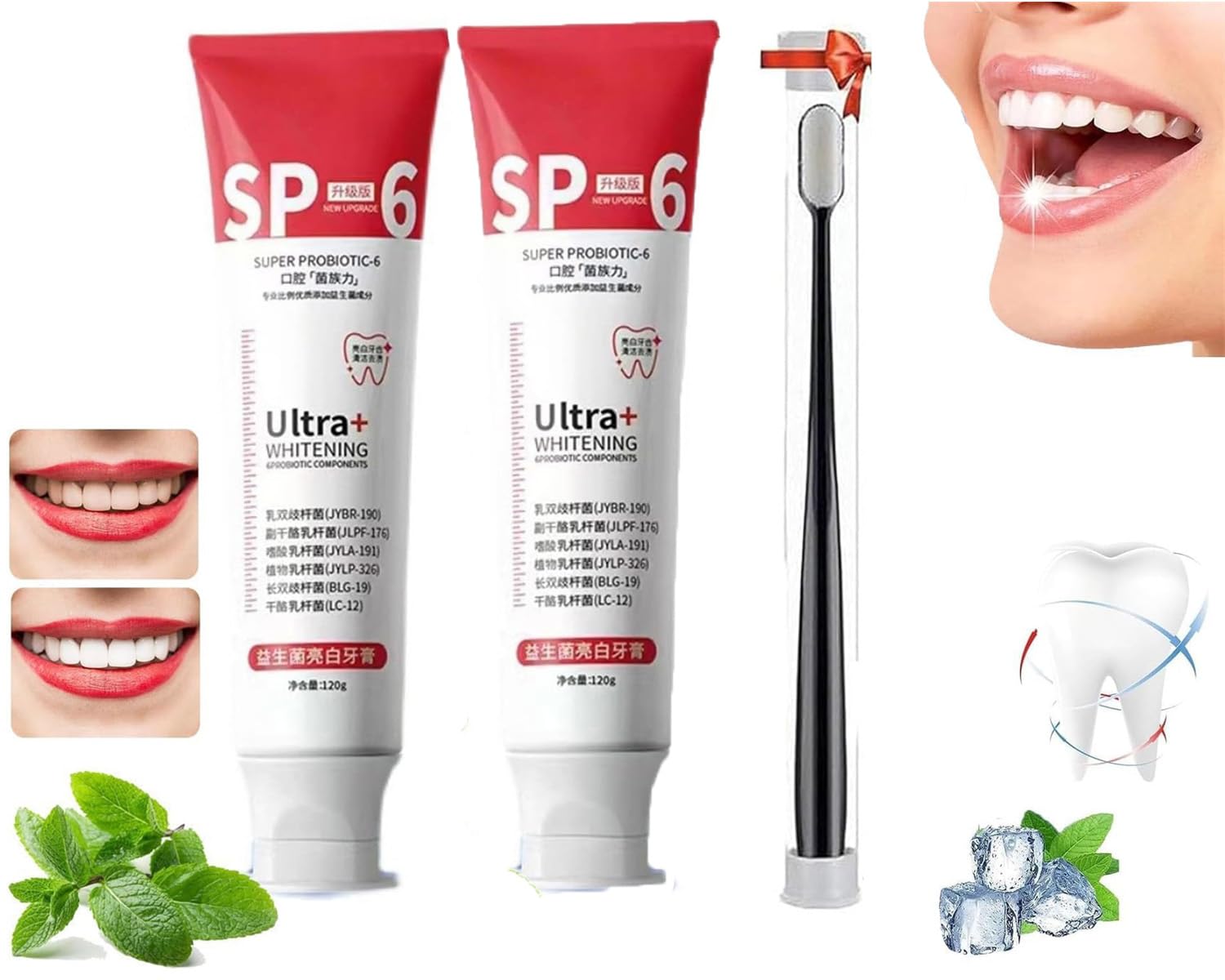 Features: Name: SP-6 Ultra Whitening Net Weight: 120g Shelf Life: 3 years Suitable for: Women, men, children Directions for Use: Apply an appropriate amount of toothpaste to the toothbrush. Brush your teeth for at least three minutes morning and night. Rinse your mouth thoroughly after brushing. Brighten your smile with super white teeth. Package Contents: 1 2 piece SP-6 Ultra Whitening 1 brush Tip: 1. Due to different monitors and lighting effects, the actual color of the product may be slightly different from the color shown in the picture. Please allow slight measurement errors due to manual measurement. DIRECTIONS FOR USE Take an appropriate amount of toothpaste and squeeze it onto the toothbrush. Brush your teeth for at least three minutes morning and night. Rinse your mouth thoroughly after brushing. Keep out of reach of children. SAFETY WARNING Keep out of reach of children. Avoid contact with eyes. See morePortable : Our portable toothpaste makes your teeth whitening process safe and convenient—at home, in the office, while traveling, anytime, anywhere. Fresh Breath: The flavor provides long-lasting freshness in your mouth for healthy teeth and gums. Promotes strong tooth enamel, whiter teeth, and fights bad breath. Brush morning, noon, and night. Easy to Use : Simply brush your teeth with our toothpaste for 3 minutes, twice a day for best results. Deep Cleansing Teeth: SP-6 toothpaste uses gentle, natural ingredients that are safe for daily use and promote a healthy mouth. Its refreshing, natural flavor leaves your mouth feeling fresh. Teeth-Cleaning Toothpaste: SP-6 Ultra Whitening contains natural ingredients that effectively and quickly remove years of stains caused by coffee, tea, and wine.Rietoiu Sp-6 Ultra Whitening, Dentifrice éclaircissant probiotique, Nettoyant en profondeur, 120 g, Naturel rafraîchissant 2 Rouges.DESCRIPTION DU PRODUIT DESCRIPTION DU PRODUIT Caractéristiques : Nom : Sp-6 Ultra Whitening Poids net : 120 g. Durée de vie : 3 ans. Convient pour : femmes, hommes, enfants. Mode d'emploi : Prenez une quantité appropriée de dentifrice et pressez-le sur la brosse à dents. Brossez-vous les dents pendant pas moins de trois minutes le matin et le soir Rincez votre bouche à temps après le brossage Égayez votre sourire avec des dents super blanches. Contenu du paquet : 1 2 pièces Sp-6 Ultra blanchissant 1 pinceau. Conseil : 1. En raison des différents écrans et effets d'éclairage, la couleur réelle du produit peut être légèrement différente de la couleur affichée sur l'image. Les mesures étant prises à la main, les tailles indiquées peuvent varier légèrement. MODE D'EMPLOI Prenez une quantité appropriée de dentifrice et pressez-le sur la brosse à dents. Lavez les dents pendant au moins trois minutes le matin et le soir. Rincer la bouche à temps après le brossage. Tenir hors de portée des enfants. AVERTISSEMENT DE SÉCURITÉ Tenir hors de portée des enfants. Évitez tout contact avec les yeux. Voir plusPortable : notre dentifrice portable rend votre processus de blanchiment des dents sûr et pratique, à la maison, au bureau, en voyage, à tout moment, n'importe où, n'importe où. Haleine fraîche : la saveur offre une fraîcheur durable dans votre bouche pour des dents et des gencives saines. Favorise l'émail des dents fortes, les dents blanches et combat la mauvaise haleine. brossez-vous les dents matin, midi et soir. Facile à utiliser : brossez simplement vos dents avec notre dentifrice pendant 3 minutes, deux fois par jour pour de meilleurs résultats. Nettoyage en profondeur des dents : le dentifrice Sp 6 utilise des ingrédients naturels doux qui sont sans danger pour un usage quotidien et favorisent une bonne situation de la bouche. Sa saveur naturelle rafraîchissante laisse votre bouche fraîche. Dentifrice nettoyant pour les dents : Sp-6 Ultra Whitening contient des ingrédients naturels qui éliminent efficacement et rapidement des années de taches causées par le café, le thé, le vin.