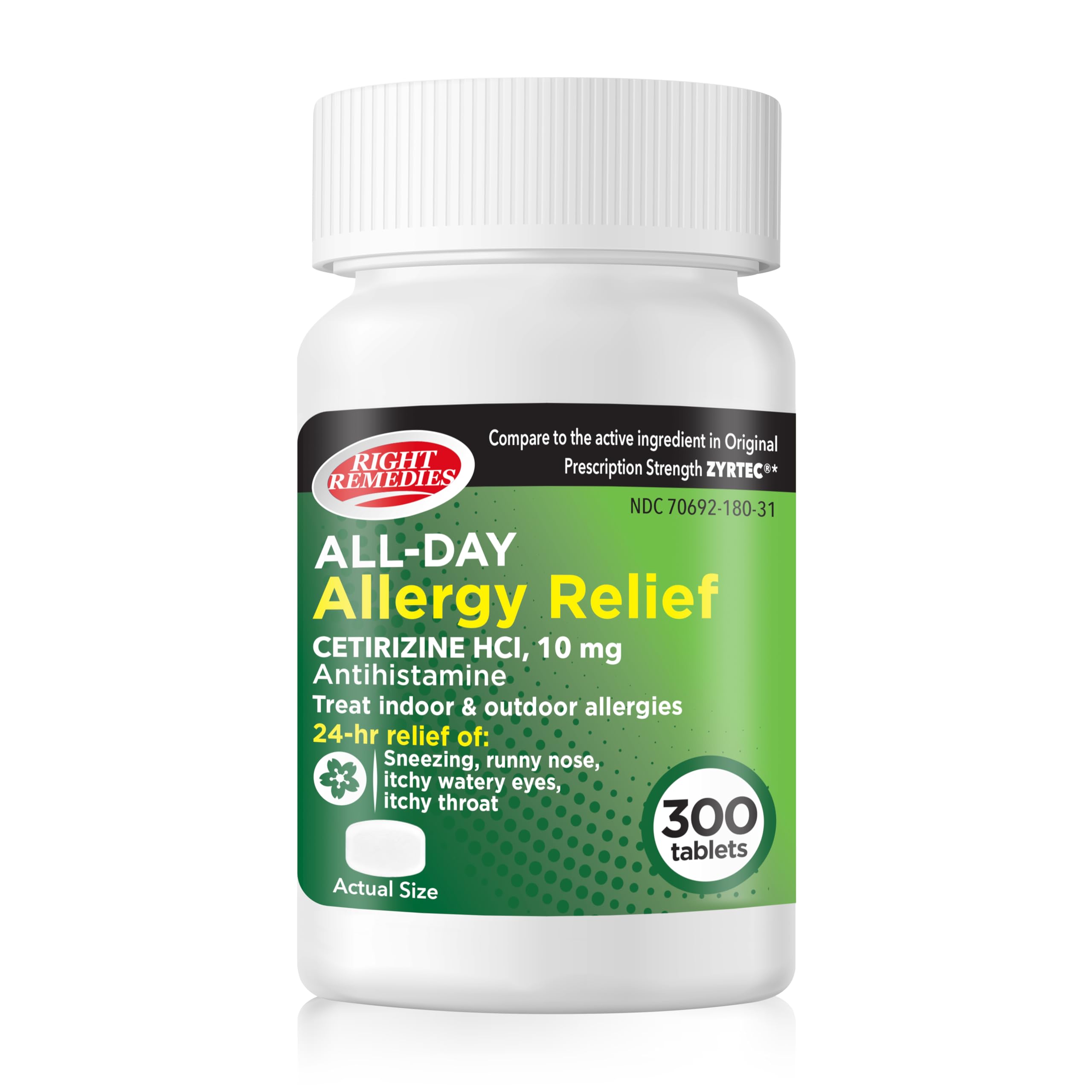 RIGHT REMEDIES 24-Hour Allergy Medicine Antihistamine (300 Tablets) | Cetirizine 10mg | for Pollen Itchy Eyes Sneezing Runny Noses | Compare to The Active Ingredient in Original Strength Zyrtec