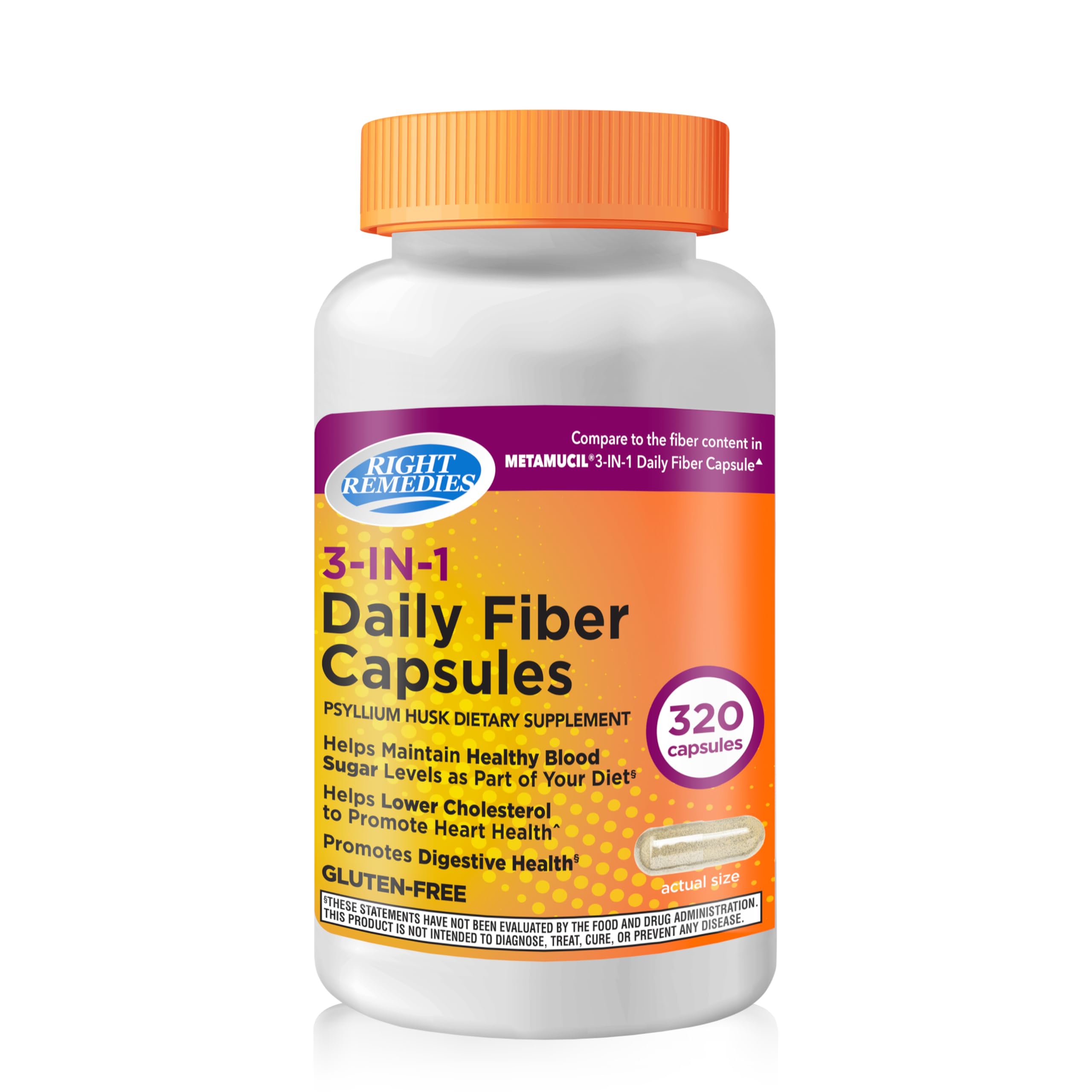 ✓Directions : Sitting or standing upright, take 1 capsule at a time consuming a full glass (8 fl oz) of water with the capsules consumed or as directed by a healthcare professional. ✓ Convenient Mess-Free : Easy-to-swallow capsules, ideal for daily use without mixing powders. ✓ Intestinal Health Regularity Support: Psyllium husk is a natural source of soluble fiber that expands when mixed with liquid, helping support regularity and overall gastrointestinal health as part of a daily fiber routine. ✓ GLUTEN-FREE : This fiber supplement contains no gluten and are made with clean ingredients for peace of mind. ✓ DIGESTION BENEFIT : Promotes Digestive Health . For promoting and maintaining digestive health. For occasional constipation and to help promote and maintain regularity. ✓ HEART HEALTH BENEFIT : Taking Right Remedies 3-IN-1 Daily Fiber Capsules, Helps Lower Cholesterol to Promote Heart Health . For lowering cholesterol to promote heart health. Diets low in saturated fat and cholesterol that include 7 grams of soluble fiber per day from psyllium husk, as in this product, may reduce the risk of heart disease by lowering cholesterol. One serving of this product has 1.8 grams of this soluble fiber.