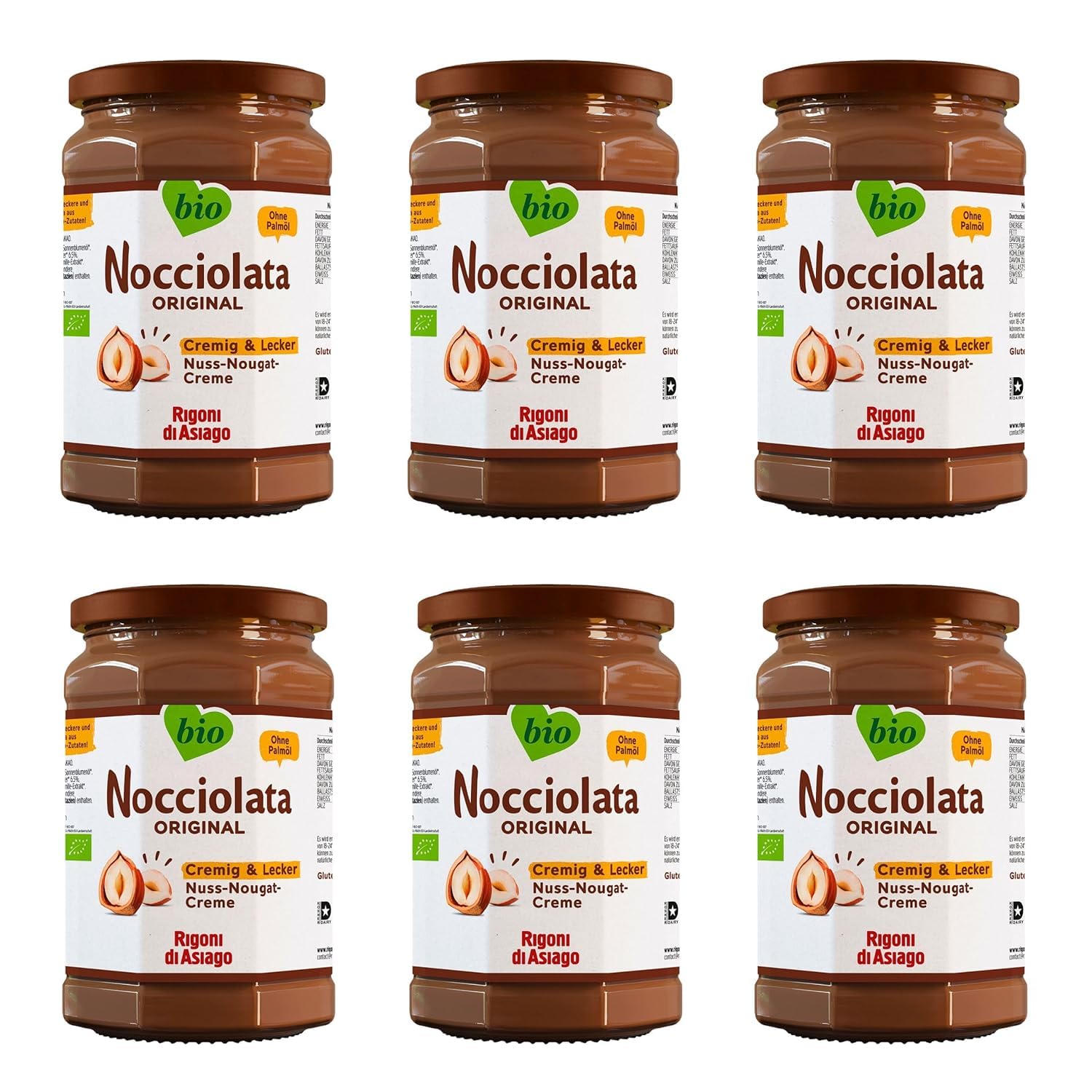Let yourself be won over by the delicious, natural taste. Nocciolata is an organic hazelnut and cocoa spread – ideal for the whole family. Perfectly balanced in taste and texture, it contains only the finest selection of organic hazelnuts, high-quality sustainable cocoa, skimmed milk, and natural bourbon vanilla. Nocciolata is free of palm oil, hydrogenated fats, artificial flavors, colors, and gluten. Whether creamy and delicious for breakfast or as a snack in between, it appeals to young and old alike. A true natural treat. INGREDIENTS Raw sugar , hazelnuts 18.5 , sunflower oil , skimmed milk powder , low-fat cocoa powder 6.5 , cocoa butter , emulsifier: soy lecithin vanilla extract . From organic farming INSTRUCTIONS FOR USE Enjoy it directly as a spread or as an ingredient in desserts. See moreRigoni di Asiago Nocciolata – 6 x 250 g, crème de nougat aux noix, crème de noisette sans huile de palme, crème de nougat aux noix sans huile de palme, délicieuse pâte à tartinerDESCRIPTION DU PRODUIT DESCRIPTION DU PRODUIT Laissez-vous conquérir par le bon goût naturel. Nocciolata est une pâte à tartiner bio à base de cacao et de noisette - Idéale pour toute la famille. Parfaitement équilibré en goût et en consistance, il contient exclusivement la meilleure sélection de noisettes biologiques, de cacao durable de haute qualité, de lait écrémé et de vanille bourbon naturelle. Nocciolata est exempt d'huile de palme, de graisses hydrogénées, d'arômes, de colorants et de gluten. Que ce soit crémeux et délicieux pour le petit-déjeuner ou comme collation entre les deux, cela a le goût des jeunes et des moins jeunes. Un vrai plaisir naturel. INGRÉDIENTS Sucre brut , noisettes 18,5 , huile de tournesol , lait écrémé en poudre , poudre de cacao faible en gras 6,5 , beurre de cacao , émulsifiant : lécithine de soja extrait de vanille . Issu de l'agriculture biologique MODE D'EMPLOI Dégustez directement comme pâte à tartiner ou comme ingrédient pour les desserts. Voir plus