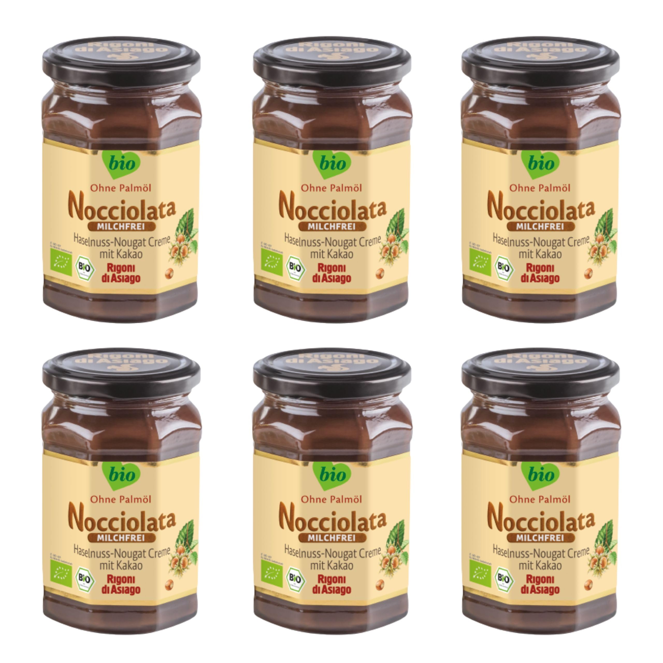 Rigoni di Asiago Nocciolata Milk Free is a particularly fine, vegan nougat cream made with organic nuts and an intense Italian nut flavor. Made using an innovative production method, the delicious natural aroma of Italian hazelnuts is preserved. Nocciolata Milk Free is 100 natural, with no added colors or flavors. It is also palm oil-free and made with sunflower oil instead. Enjoy this delicate cream on bread for a tasty snack or with pancakes, cakes, and ice cream. INGREDIENTS Raw sugar , HAZELNUTS 19.5 , sunflower oil , low-fat cocoa powder 11 , cocoa butter , emulsifier: soy lecithin vanilla extract . From organic farming. INSTRUCTIONS FOR USE Enjoy as is on bread for a snack or with pancakes, cakes, and ice cream. See moreRigoni di Asiago Nocciolata – Sans lait, 6 x 650 g, crème de noisette sans huile de palme, crème de nougat sans huile de palme, délicieuse pâte à tartinerDESCRIPTION DU PRODUIT DESCRIPTION DU PRODUIT Rigoni di Asiago Nocciolata Lait Free est une crème de nougat végétalienne aux noix bio particulièrement fine avec un arôme intense de noix d'Italie. Fabriqué avec une méthode de production innovante, le délicieux arôme naturel des noisettes italiennes est conservé. Le lait Nocciolata est 100 naturel, sans ajout de colorants et d'arômes. De plus, il est exempt d'huile de palme et est fabriqué à la place avec de l'huile de tournesol. Utilisez la crème délicate sur du pain pour une collation savoureuse ou avec des crêpes, des gâteaux et de la glace. INGRÉDIENTS Sucre brut , NOISELES 19,5 , huile de tournesol , poudre de cacao faible en gras 11 , beurre de cacao , émulsifiant: lécithine de soja extrait de vanille . issu de l'agriculture biologique. MODE D'EMPLOI À consommer tel quel sur du pain pour une collation ou avec des crêpes, des gâteaux et de la glace. Voir plus