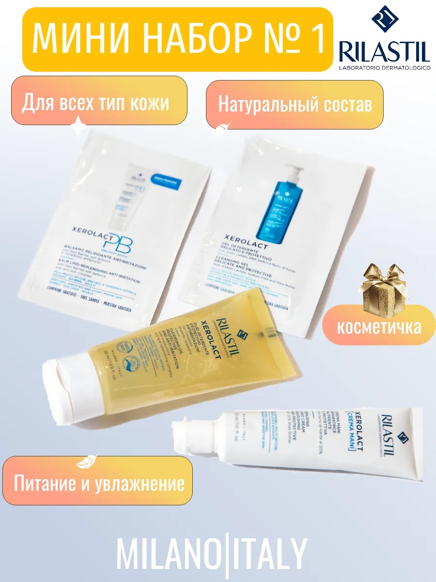 Идеальный набор миниатюр, чтобы попробовать средства ухода за кожей от бренда Риластил. В него входят: XEROLACT Защитное Успокаивающее масло для очищения (50 мл) + XEROLACT HAND CREAM Восстанавливающий крем для рук (15 мл) + XEROLACT CLEANSING GEL Мягкий очищающий защитный гель (7 Мл) + Липидовосстанавливающий бальзам (7 мл). Итальянский крем для рук Rilastil Xerolact восстанавливает, насыщает влагой и полезными микро- и макроэлементами, защищает кожу рук, придавая ей мягкость, эластичность и бархатистость. Крем для интенсивного ухода применяется для очень сухой, потрескавшейся кожи рук, после воздействия ветра, холода или агрессивных веществ. Рекомендуется использовать крем как sos-средство после работы в перчатках из резиновых материалов или для восстановления и питания кожи рук после бытовых работ, или работ в медицинских организациях, косметических салонах и других предприятиях. Этот увлажняющий крем идеально подходит для ежедневного (дневного и ночного) применения Нежно очищает кожу лица и тела и обеспечивает ей комфорт и увлажнение. Масло помогает восстановить кожный барьер, делая кожу более увлажненной. Применяется при очень сильной сухости кожи, склонности к атопии и зуду. Не раздражает глаза.Сохраняет увлажнение кожи на 24 часа. Гель для умывания обладает защитным, смягчающим и увлажняющим действием. Бальзам для тела, против раздражения для атопичной, проблемной и очень сухой кожи от шелушения создан для восстановления, увлажнения, питания и комфорта Вашей кожи, при сильной сухости и склонности к атопии для малышей, для детей и для взрослых мужчин и женщин. Ваша кожа будет выглядеть безупречно каждый день!
